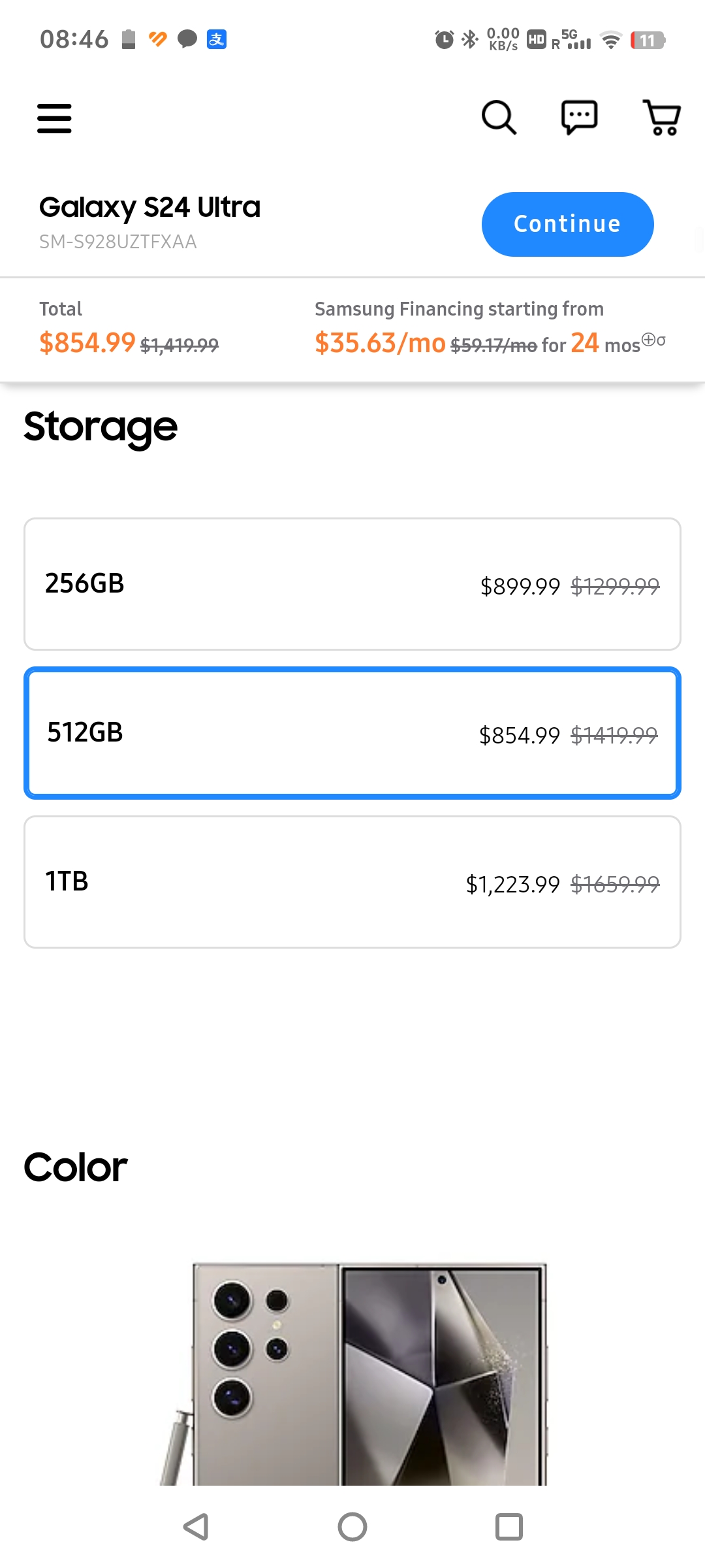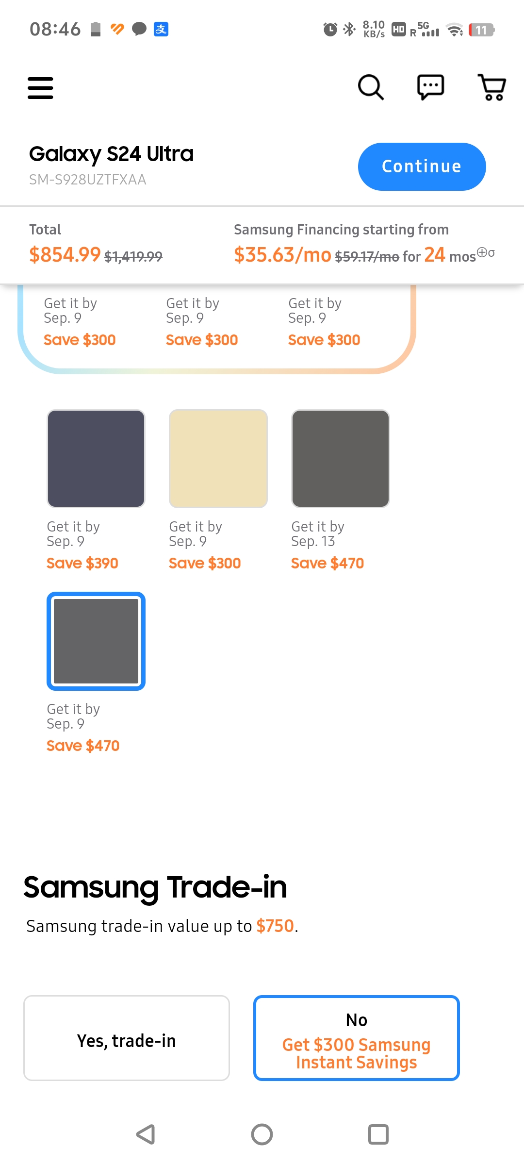 | Samsung 手机 App 上的 Galaxy S24 Ultra 解锁版 512GB 智能手机, 无需Trade-in直接 -$300,选择灰色或者黑色 -$170,下单界面再-$50,配合edu学生优惠,现价$804.99(指导价$1419.99),仅限512G 需要登录Samsung 手机 App并使用Education Discount,选择灰色或者黑色,并且进入下单界面