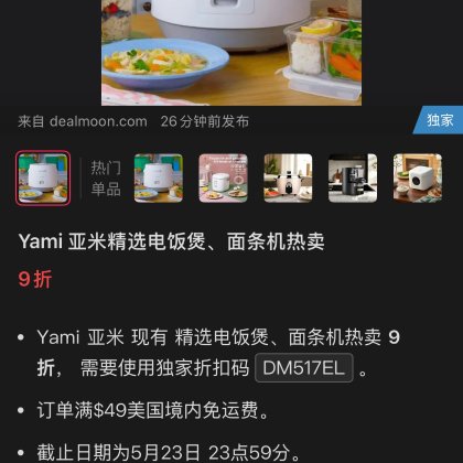 去购买 更新于2025-05-23 独家 [已过期]Yami 亚米精选电饭煲、面条机热卖 9折 Yami 亚米 现有 精选电饭煲、面条机热卖 9折, 需要使用独家折扣码 DM517EL 。 订单满$49美国境内免运费。 截止日期为5月23日 23点59分。 点击购买>> $89.99 $199.99 cuckoo 电饭煲10杯米容量 CR-1095 $38.24 $52.49 苏泊尔SUPOR 迷你电饭煲 小型电饭煲煮饭锅家居两人食 超轻超便携 1.2L SF12HP36US $152.99 $219.99 台湾TATUNG大同 家用多功能电饭煲电饭锅电锅 不锈钢饭煲 奶油粉色 6杯/米 TAC-06IN $224.10 $389.98 JOYOUNG九阳 智能自动加水面条机 【面水配比智能称重 M6-L20S【爆款新品】 $73.79 $129.99 Bear 家用小型智能控温电饭煲 $125.99 $167.89 Aroma 全玻璃蒸汽电饭煲电蒸锅 养生低糖饭 8杯熟米容量 AMC-800 $121.49 $145.00 Joyoung 大容量电压力锅 电饭锅 Y-50C19 5L 3-7人适用 $32.39 $39.99 Aroma 数显电饭煲 8杯熟米容量 ARC-914D 2年制造商保修 | 亚米 English 报告错误 Yami 亚米 5 7 13 写评论 评论 问大家 深夜里有阳光 : 面条机有买过的集美说说好不好吗 面条机有买过的集美说说好不好吗 2025-05-17 删除 | 举报 | 赞 | 回复 @宥宥爱吃肉肉 : 好用是好用的,就是用的频率不高,但自己做胜在干净卫生好控量,也新鲜。 好用是好用的,就是用的频率不高,但自己做胜在干净卫生好控量,也新鲜。 2025-05-17 删除 | 举报 | 1 | 回复 最新评论 5 跑跑江湖 : 最近超爱迷你便携式的家用电器 最近超爱迷你便携式的家用电器 2025-05-18 删除 | 举报 | 2 | 回复 紫罗兰8888 : 这个电饭煲好用 这个电饭煲好用 2025-05-17 删除 | 举报 | 赞 | 回复 深夜里有阳光 : 面条机有买过的集美说说好不好吗 面条机有买过的集美说说好不好吗 2025-05-17 删除 | 举报 | 赞 | 回复 @宥宥爱吃肉肉 : 好用是好用的,就是用的频率不高,但自己做胜在干净卫生好控量,也新鲜。 好用是好用的,就是用的频率不高,但自己做胜在干净卫生好控量,也新鲜。 2025-05-17 删除 | 举报 | 1 | 回复 wellwellwell : 不错 不错 2025-05-17 删除 | 举报 | 1 | 回复 呃呃呃呃呃呃 : 不错 不错 看大图 / 2025-05-17 删除 | 举报 | 赞 | 回复