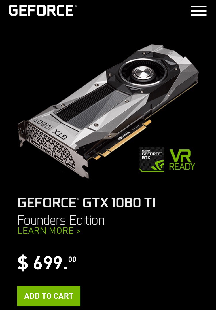 去购买 更新于2018-06-27 [已过期]NVIDIA 官网 FE公版显卡补货 TTxP星战版到货 1080 FE $549, 1080Ti FE $699 NVIDIA 现有 NVIDIA GeForce GTX 英伟达官网补货。 下单还赠送飙酷车神2。 美国境内免运费。 点击购买>> 小编推荐:GeForce GTX Founders 补货,买官卡充信仰!限量供应,每人限购两张!从够用的GTX 1060到1080 Ti 全都有,手慢无! 感谢 @春风十里不如你z 提供的爆料信息,点击参与爆料 $299.00 每人限购2张 Nvidia GeForce GTX 1060 官方显卡 $399.00 每人限购2张 Nvidia GeForce GTX 1070 官方显卡 $449.00 每人限购2张 Nvidia GeForce GTX 1070Ti 官方显卡 $549.00 每人限购2张 Nvidia GeForce GTX 1080 官方显卡 $699.00 每人限购2张 Nvidia GeForce GTX 1080Ti 官方显卡 $1200.00 每人限购2张 Nvidia TITAN Xp 官方显卡 English 报告错误 NVIDIA 11 39 47 写评论 评论 最新评论 30 豬頭 : 现在每人限购10张? 现在每人限购10张? 2018-07-10 删除 | 举报 | 赞 | 回复 @鹏废 : 是现在每人限购10张 是现在每人限购10张 @鹏废 回复 @匿名用户 : 🌚🌚还是喜欢老卡 🌚🌚还是喜欢老卡 3条相关评论 卡尔度 : 1180要出了。再等等 1180要出了。再等等 2018-07-05 删除 | 举报 | 2 | 回复 SixSeven : 下了单,没看到有送游戏啊 下了单,没看到有送游戏啊 2018-06-28 删除 | 举报 | 赞 | 回复 @匿名用户 : 你选的是GeForce GTX 1080吗? 加入购物车就已经显示了有游戏了啊 你选的是GeForce GTX 1080吗? 加入购物车就已经显示了有游戏了啊 2018-06-28 美国 纽约 删除 | 举报 | 赞 | 回复 @SixSeven 回复 @匿名用户 : 买的别的 可能没送游戏 买的别的 可能没送游戏 2018-06-29 删除 | 举报 | 赞 | 回复 Lawliet : 不是某顶级产商退了30w 这还挤牙膏式补货? 不是某顶级产商退了30w 这还挤牙膏式补货? 2018-06-27 删除 | 举报 | 赞 | 回复 tomcattx : 公版啸叫了解一下 公版啸叫了解一下 2018-06-27 删除 | 举报 | 赞 | 回复 微软小冰 : nvidia真是再生父母啊,竟然给我们供货了 nvidia真是再生父母啊,竟然给我们供货了 2018-06-27 删除 | 举报 | 赞 | 回复 smallhanhanhan : 建议等出新卡,还是买了1080ti等新卡的ti版 建议等出新卡,还是买了1080ti等新卡的ti版 2018-06-26 删除 | 举报 | 1 | 回复 @runlifruit : 那你要等一阵子了 那你要等一阵子了 2018-06-28 删除 | 举报 | 赞 | 回复 Desolate_puppy : 抢了2块1080Ti! 抢了2块1080Ti! 2018-06-26 删除 | 举报 | 赞 | 回复 Ryzen8700k : 感恩戴德原价入 感恩戴德原价入 2018-06-26 删除 | 举报 | 赞 | 回复 鹏废 : 炫酷车神2是啥 炫酷车神2是啥 2018-06-26 删除 | 举报 | 赞 | 回复 @空格键 : 一款新出的 能开车,飞机,船的游戏。 一款新出的 能开车,飞机,船的游戏。 @依啡 回复 @匿名用户 : 扫雷~ 扫雷~ 6条相关评论 豬頭 : 1080ti 已有货 1080ti 已有货 2018-06-26 删除 | 举报 | 赞 | 回复 songleyun : 忍住忍住等新卡 忍住忍住等新卡 2018-06-26 删除 | 举报 | 赞 | 回复 @Destiny槿年 : 然后等物流,等预期发货时间你还要等多久? 然后等物流,等预期发货时间你还要等多久? 2018-06-26 删除 | 举报 | 赞 | 回复 Kszz : 640买的1080🤯 640买的1080🤯 2018-06-26 删除 | 举报 | 赞 | 回复 KenHuang : 這個算便宜嗎 這個算便宜嗎 2018-06-26 删除 | 举报 | 赞 | 回复 @夜夜好心情 : 不算 不算 2018-06-26 删除 | 举报 | 赞 | 回复 春风十里不如你z : 终于蹲到了 终于蹲到了 2018-06-26 删除 | 举报 | 赞 | 回复 @ZAZATT : 下个月出新卡啦1180 下个月出新卡啦1180 2018-06-26 删除 | 举报 | 赞 | 回复