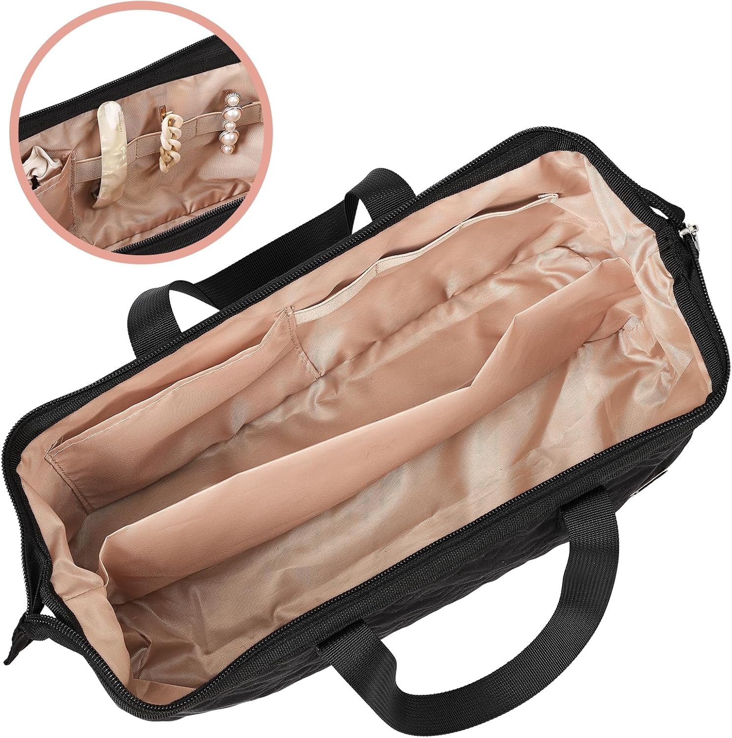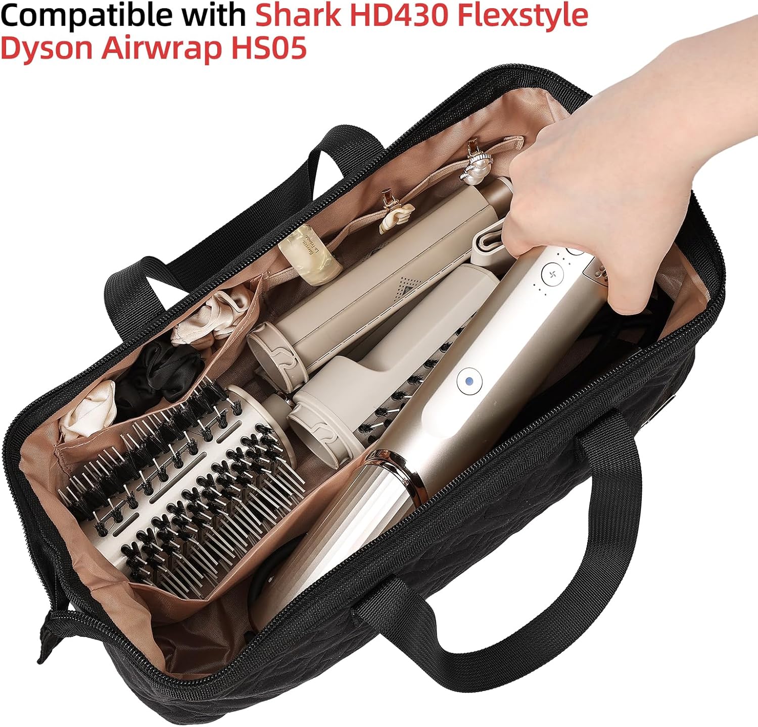 小编推荐:这款美发工具包专为收纳吹风机、卷发棒等造型工具设计,内部设有隔层和弹性绑带,可有效防止设备在携带过程中碰撞刮擦。宽口设计配合硬质边框,方便快速取放物品。双提手设计便于手提或臂挂,适合旅行或日常收纳使用。