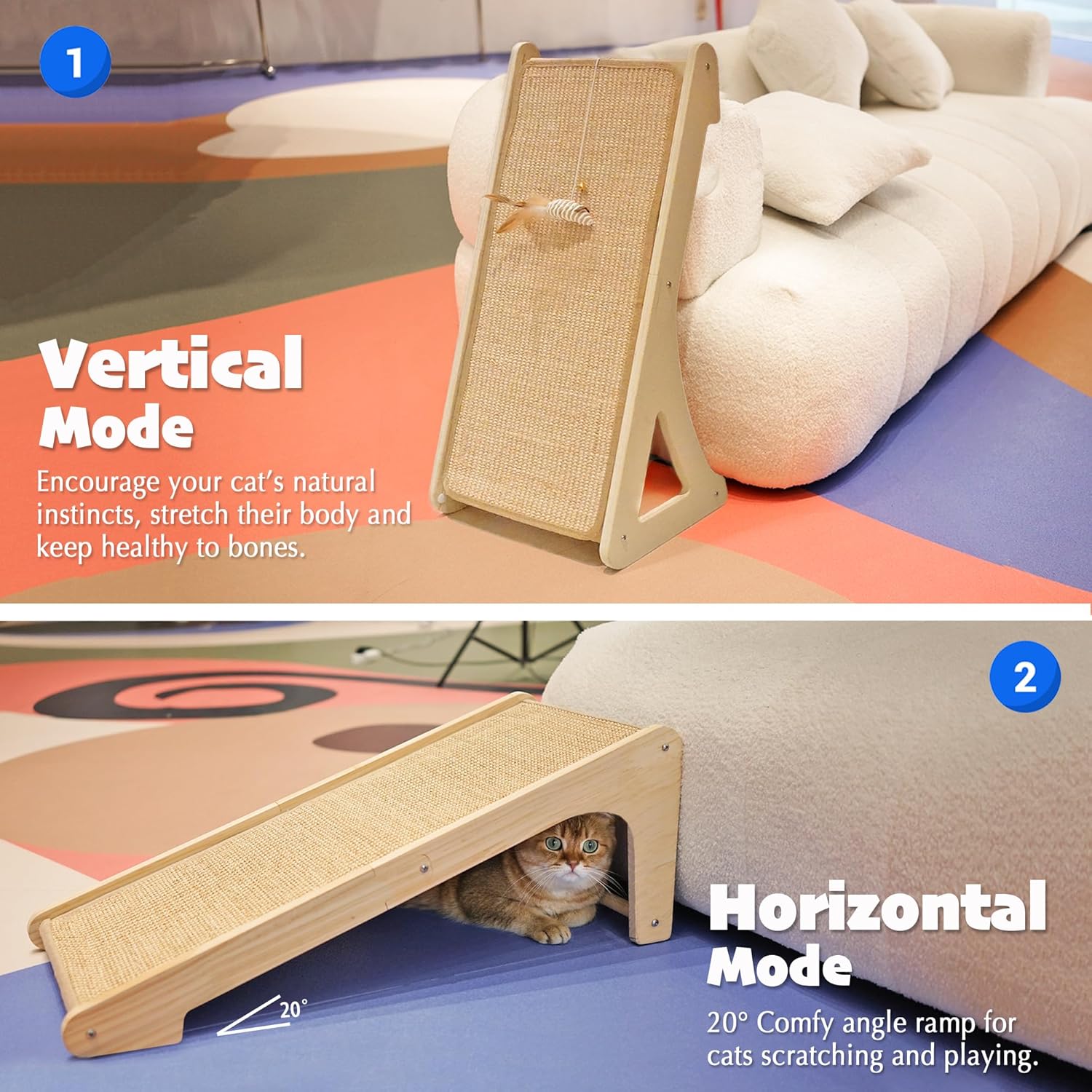 小编推荐:这款L型猫抓板采用天然麻织材料,符合猫咪抓挠天性。可提供两种放置方式:地面斜坡式或通过魔术贴固定在墙上,20度倾斜角度设计舒适。稳固的木结构耐用,附带猫薄荷和小鼠玩具,有助于引导猫咪行为,保护家具。
