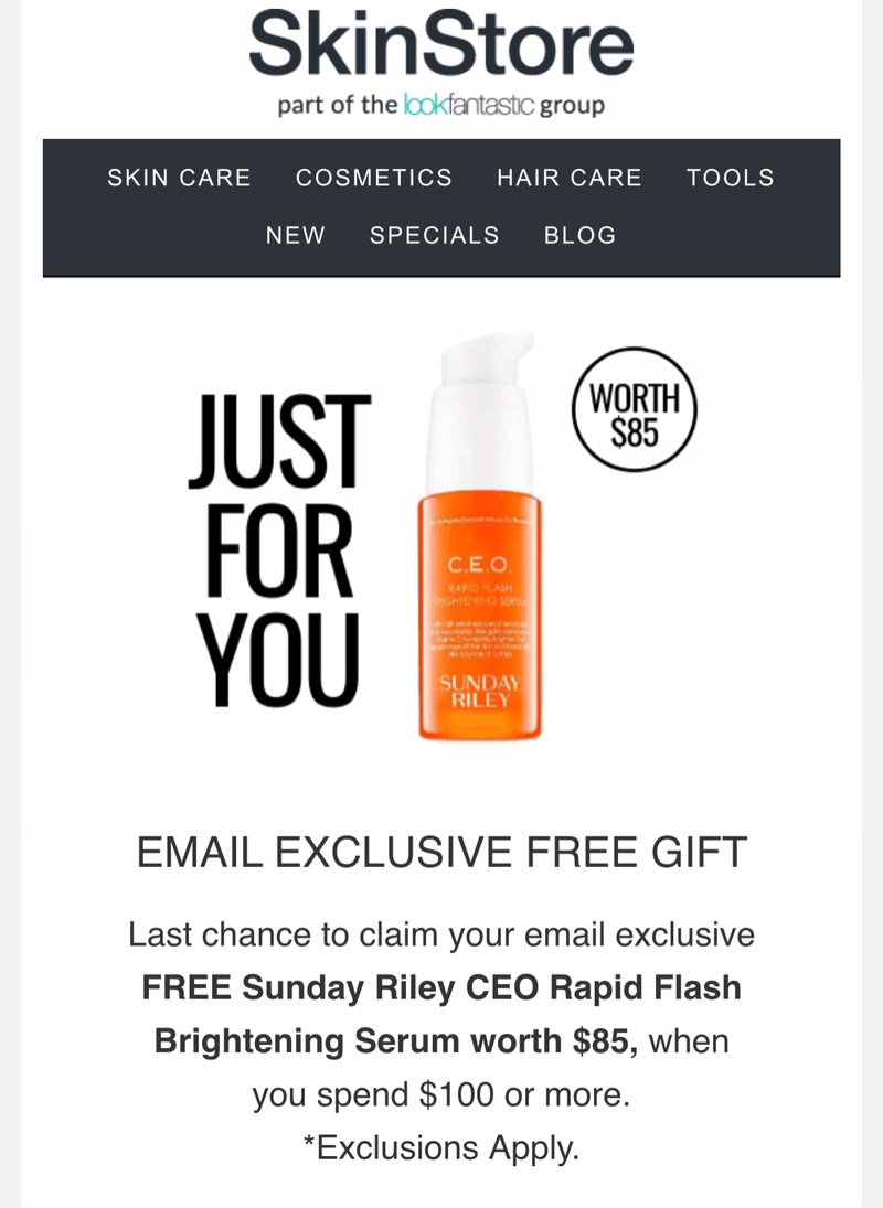 SkinStore 满$100送Sunday Riley CEO Rapid Fresh Brightening Serum 价值$85 及满$90送 Elemis Papaya Enzyme Peel 50ml 价值$45
