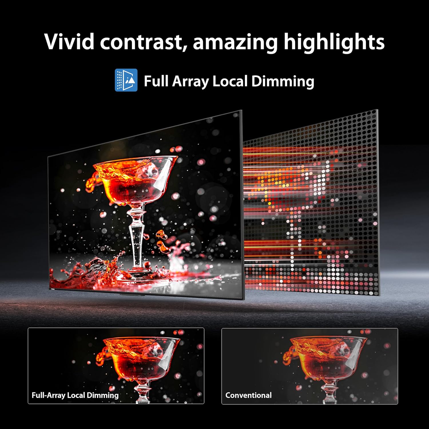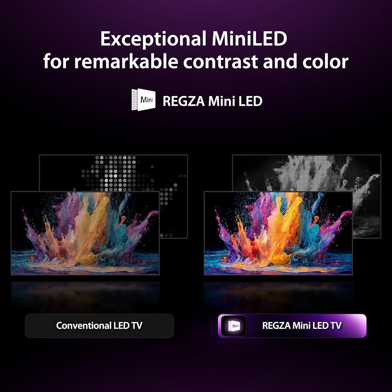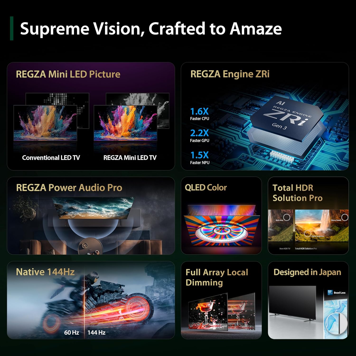 小编推荐:这款100英寸Mini-LED 4K智能电视采用全阵列局部调光技术,带来深邃黑色与明亮高光。搭载第三代REGZA Engine ZRi AI画质引擎和REGZA Power Audio Pro音响系统,配备低音炮,声音表现震撼。原生144Hz刷新率配合Game Mode Pro,支持AMD FreeSync Premium和VRR,游戏体验流畅。支持Dolby Vision IQ、HDR10+等多种HDR格式,色彩生动。内置Fire TV和Alexa语音助手,操作便捷。设计简约现代,并配备AI光感器,可根据环境光自动调节画面。
