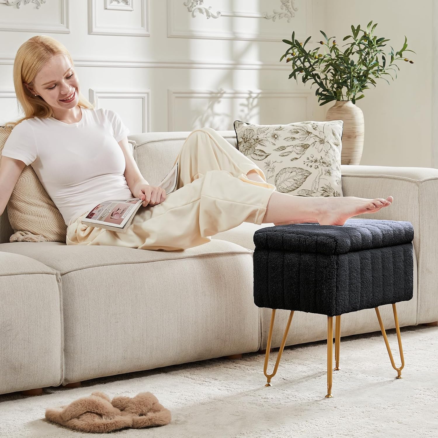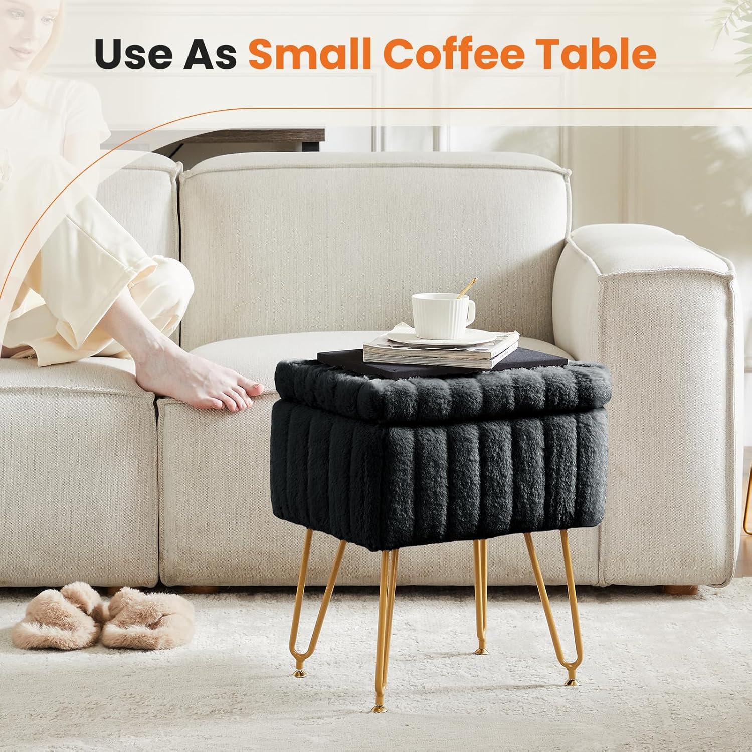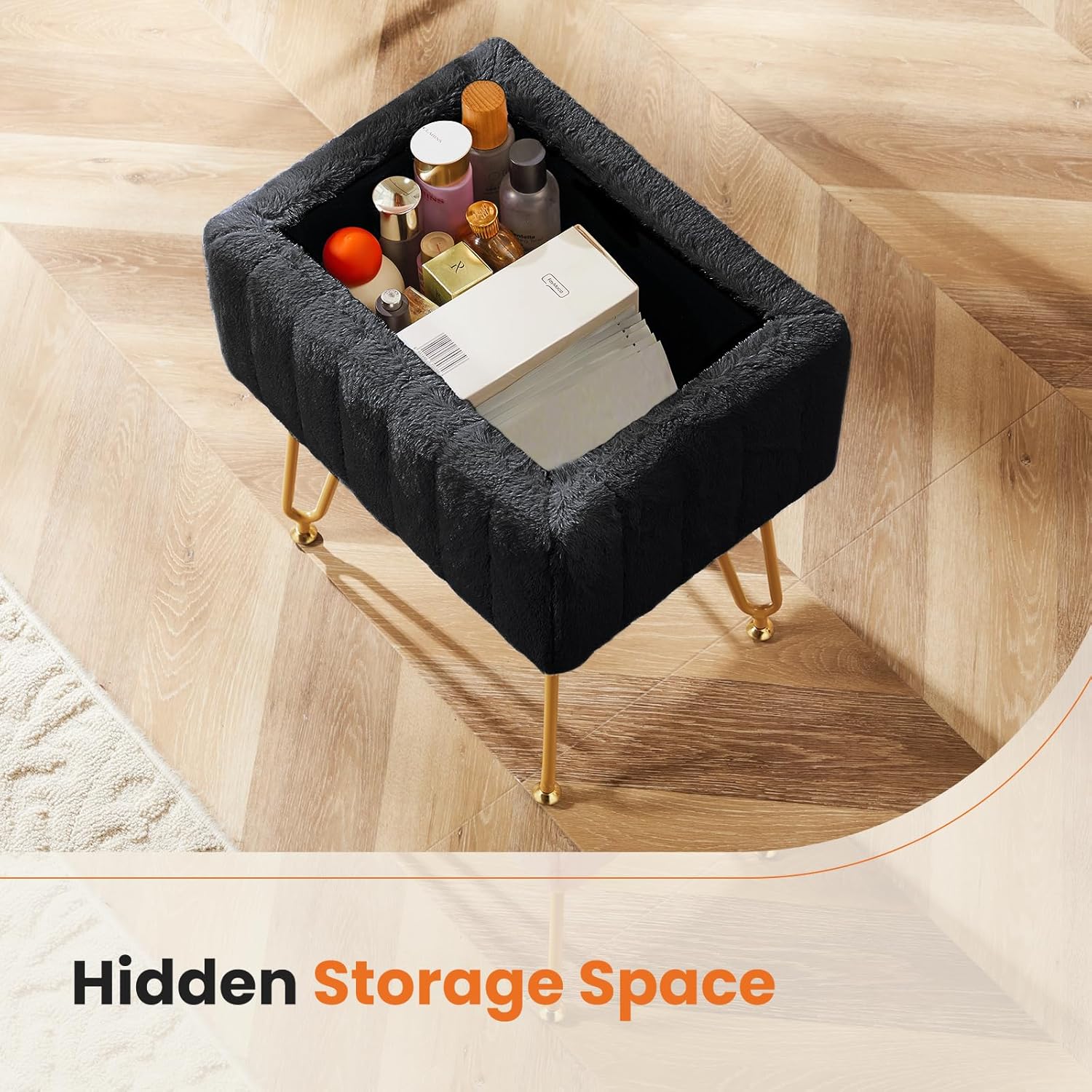 小编推荐:这款梳妆凳采用隐藏式储物设计,提供约10升存储空间,可收纳杂志或小瓶化妆品。座垫覆盖柔软的仿羔皮面料,触感亲肤,搭配坚固的金属腿框架,确保稳定支撑。可调节底脚适应木地板或地毯等不同地面,安装仅需约10分钟。现代风格设计,多场景适用,可作为化妆凳、脚凳或咖啡桌使用。