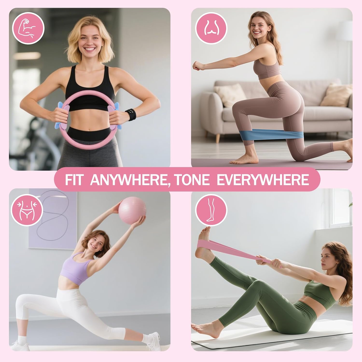 小编推荐:这套粉色普拉提套装包含普拉提圈、5级阻力带和健身球,适合居家塑形训练。普拉提圈采用玻璃纤维材质,带有防滑纹理衬垫和符合人体工学的握把,使用舒适。阻力带提供从5磅到40磅的不同阻力级别,便于循序渐进地锻炼手臂和腿部肌肉。健身球可快速充气,整套装备便于收纳携带,方便在客厅、办公室或旅途中随时进行核心激活和身体塑形练习。