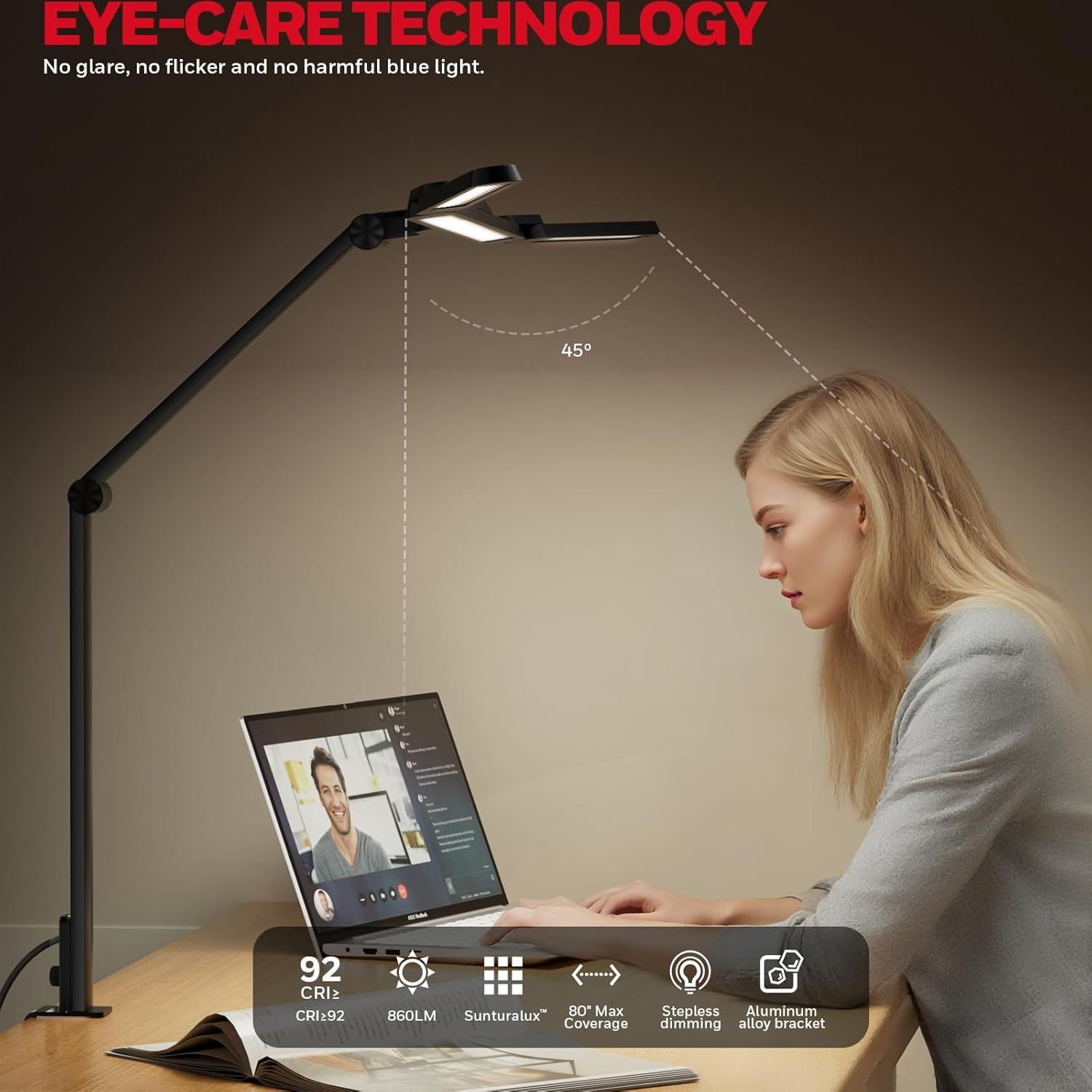 小编推荐:这款台灯采用三段式可调灯臂设计,可灵活定位,为双显示器或大桌面提供宽广均匀的照明。全光谱RG0低蓝光、无频闪技术和高显色指数(Ra≥92)有助于在长时间面对屏幕时营造舒适的视觉环境。支持3000K-5700K色温无级调节及亮度平滑调整,适应工作、阅读、视频会议等不同场景。采用铝和耐用金属部件制造,结构稳固,使用寿命长。
