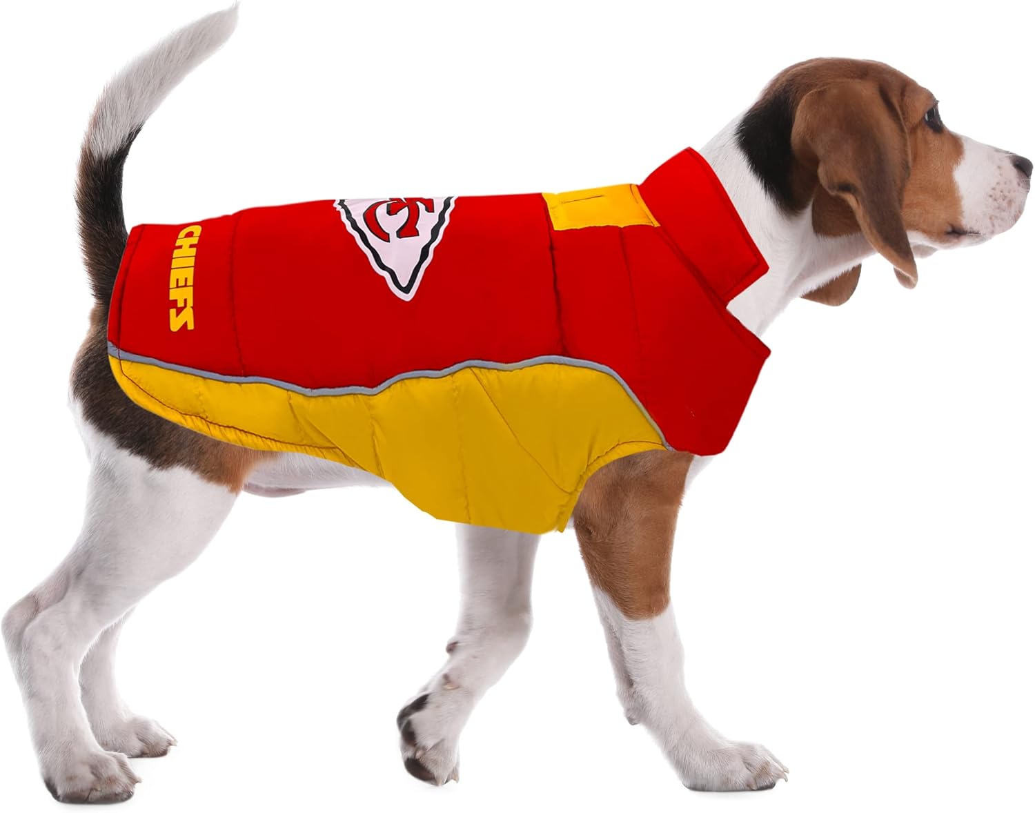 小编推荐:这款宠物羽绒背心设计保暖且防水防风,适合寒冷天气外出时穿着。背部印有NFL球队标志,展现萌宠个性。腹部的按扣绑带设计可调节松紧,方便穿脱,并留有扣眼可连接牵引绳。
