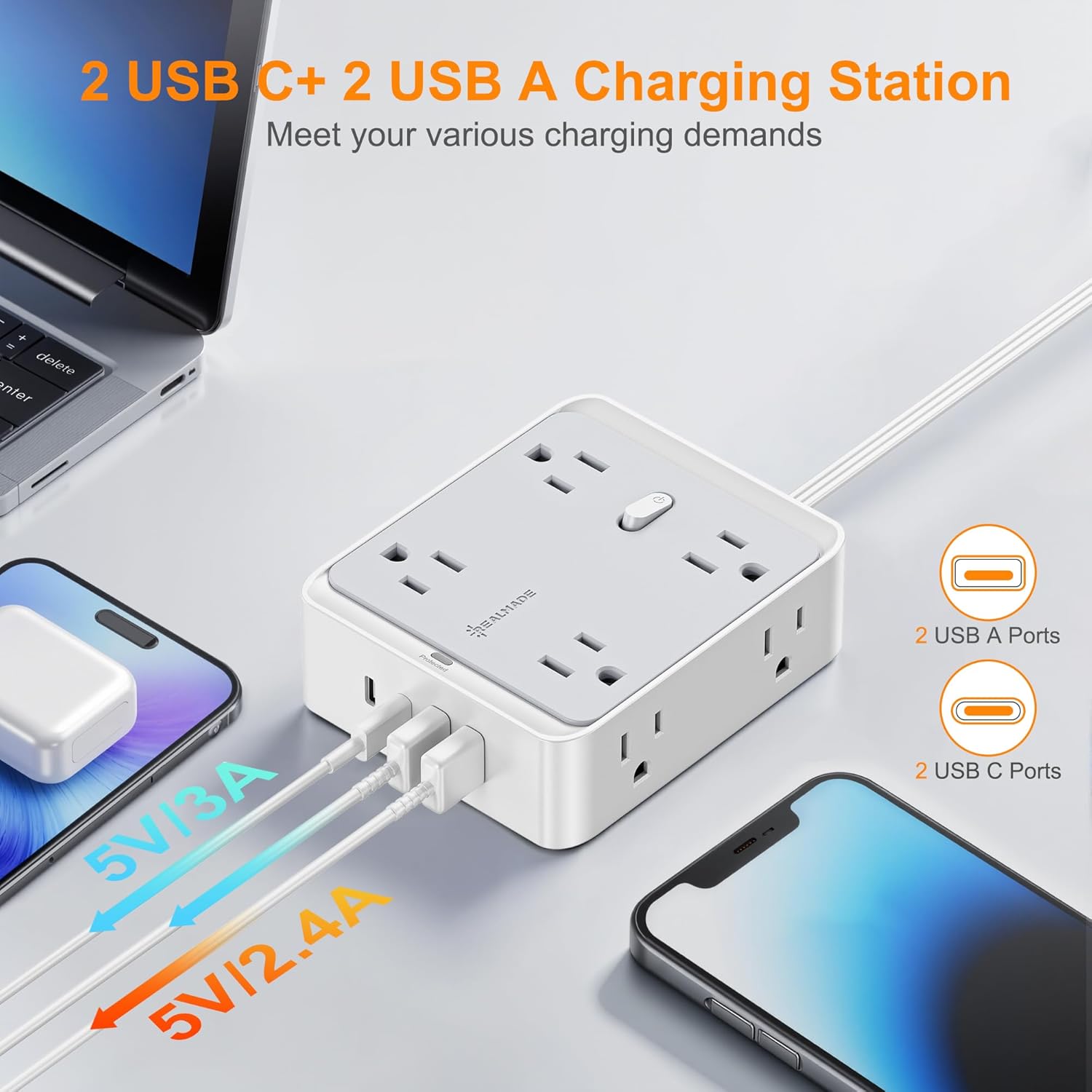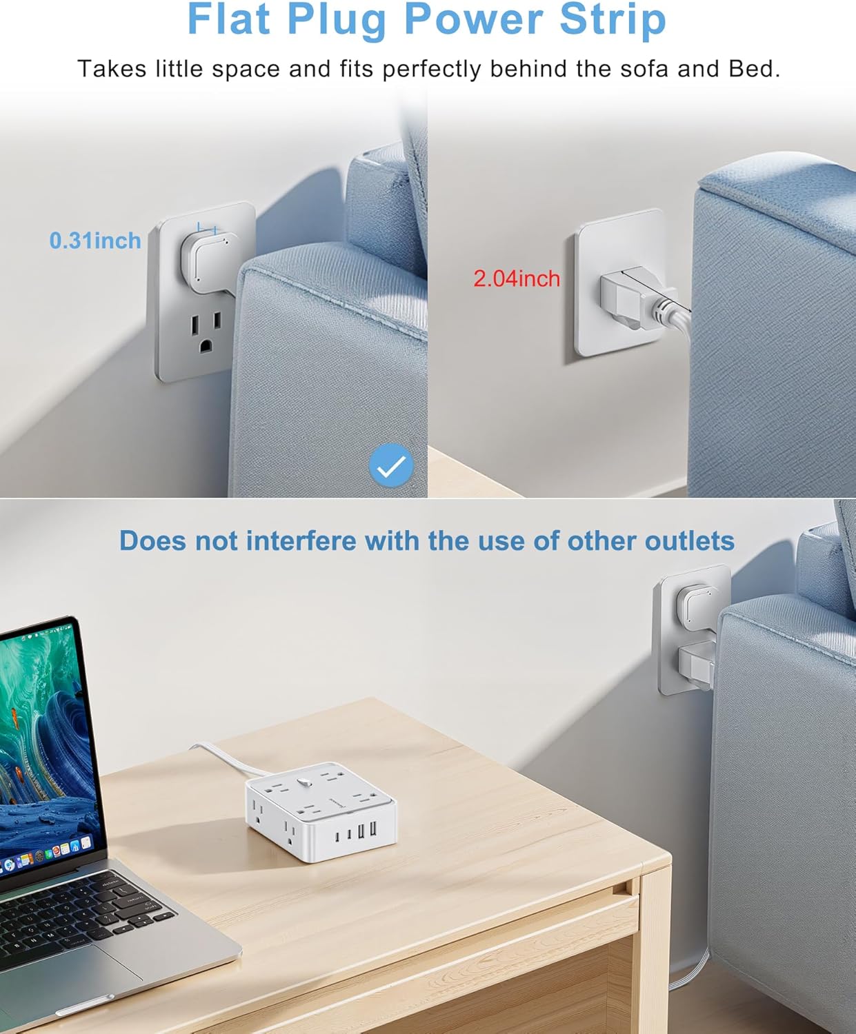 小编推荐:这款电源排插配备8个AC插座和4个USB充电口(含2A+2C),可同时为多达12台设备供电和充电。智能USB端口自动识别设备以提供优化充电速度。45度超薄扁平插头和扁平延长线设计,适合轻松塞入家具后使用。采用950焦耳浪涌保护技术,内置安全开关及多重防护功能,有效保护电器安全。插座间距宽裕,可容纳大型适配器,背部挂孔和底部防滑脚垫提供了灵活的壁挂或桌面放置选择。