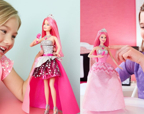 小编推荐:来自女孩们都喜欢的电影“芭比之公主和摇滚训练营”,粉色长发芭比手握麦克风,穿着短裙唱歌,可是一转身就变成身着粉色蓬蓬裙的优雅公主。