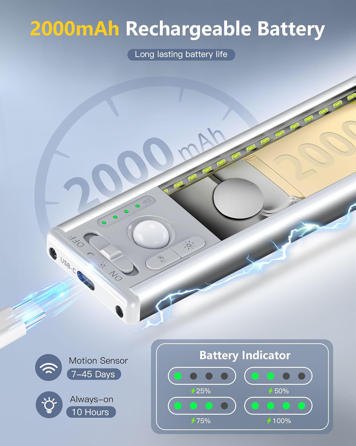 小编推荐:这款橱柜灯套装包含两盏10.5英寸的无线感应灯,内置2000mAh可充电电池,支持USB充电。提供三种色温(白光、暖光、自然光)和五档亮度调节,可根据不同场景需求自定义照明。内置强磁铁,可轻松吸附于金属表面,非金属表面可使用附赠的金属贴片安装,无需工具或打孔。感应模式智能省电,在检测到运动后自动点亮,静止20秒后关闭,适合厨房橱柜下、走廊、楼梯或衣柜等空间使用。