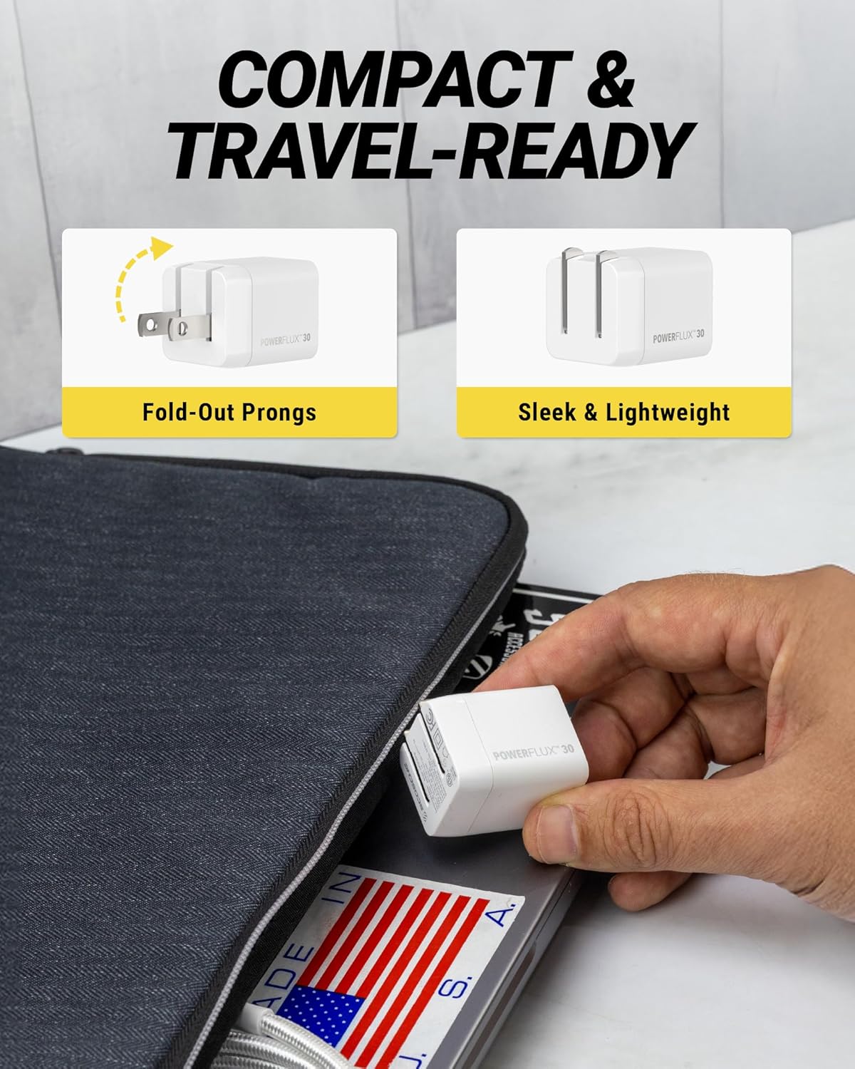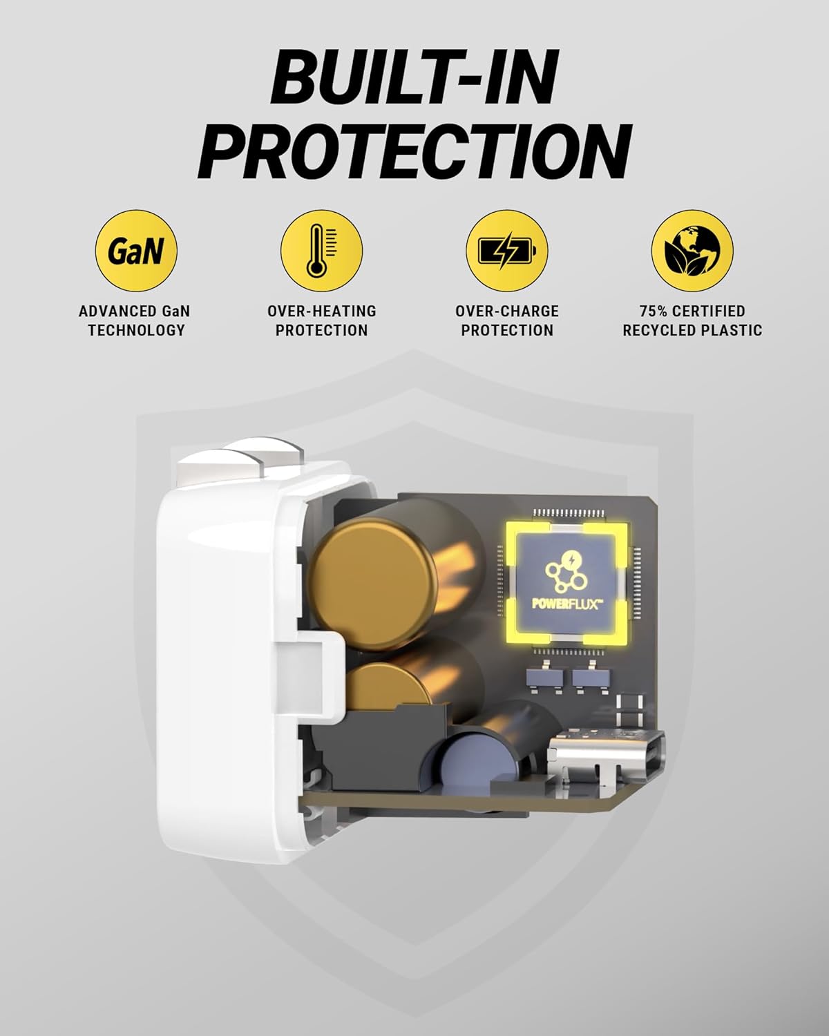 小编推荐:这款充电器采用PowerFlux技术,可智能识别设备并精准分配30W快充功率,兼容PD和PPS协议。其GaN(氮化镓)技术确保高效充电的同时保持低温运行,折叠插头设计便于携带。兼容iPhone、iPad、MacBook、三星Galaxy等多种设备,并采用75%认证回收塑料制造。