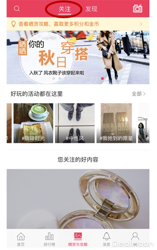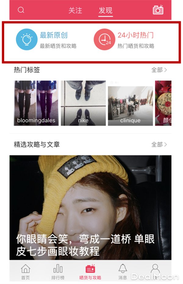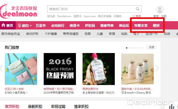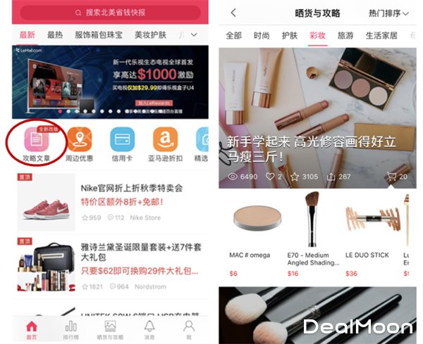 - 打开DealMoon主页即可看到“攻略文章”、和“晒货”两个入口,点击即可刷攻略、刷晒货啦!