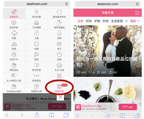 - 手机浏览器打开www.dealmoon.com,如下图所示即可看到最新的攻略文章频道