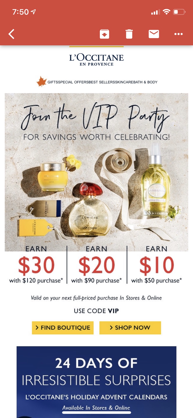 - L'Occitane官网 现有护肤产品满$50送$10,满$90送$20,或满$120送$30热卖,需使用优惠码 VIP 。