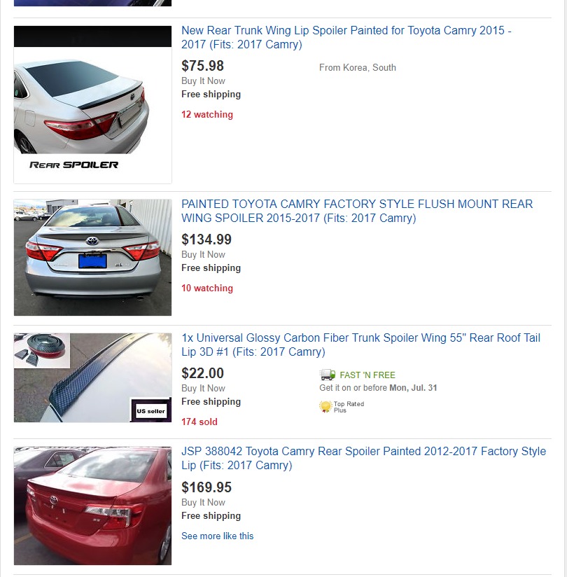 只需前往eBay.com在搜索栏中搜索“汽车的年份 品牌 型号 Rear Spoiler”,也可以按照自己的喜好增加更多筛选的选项,比如颜色、材料、或是样式。以2017款Camry为例,可以得到非常多的结果:
