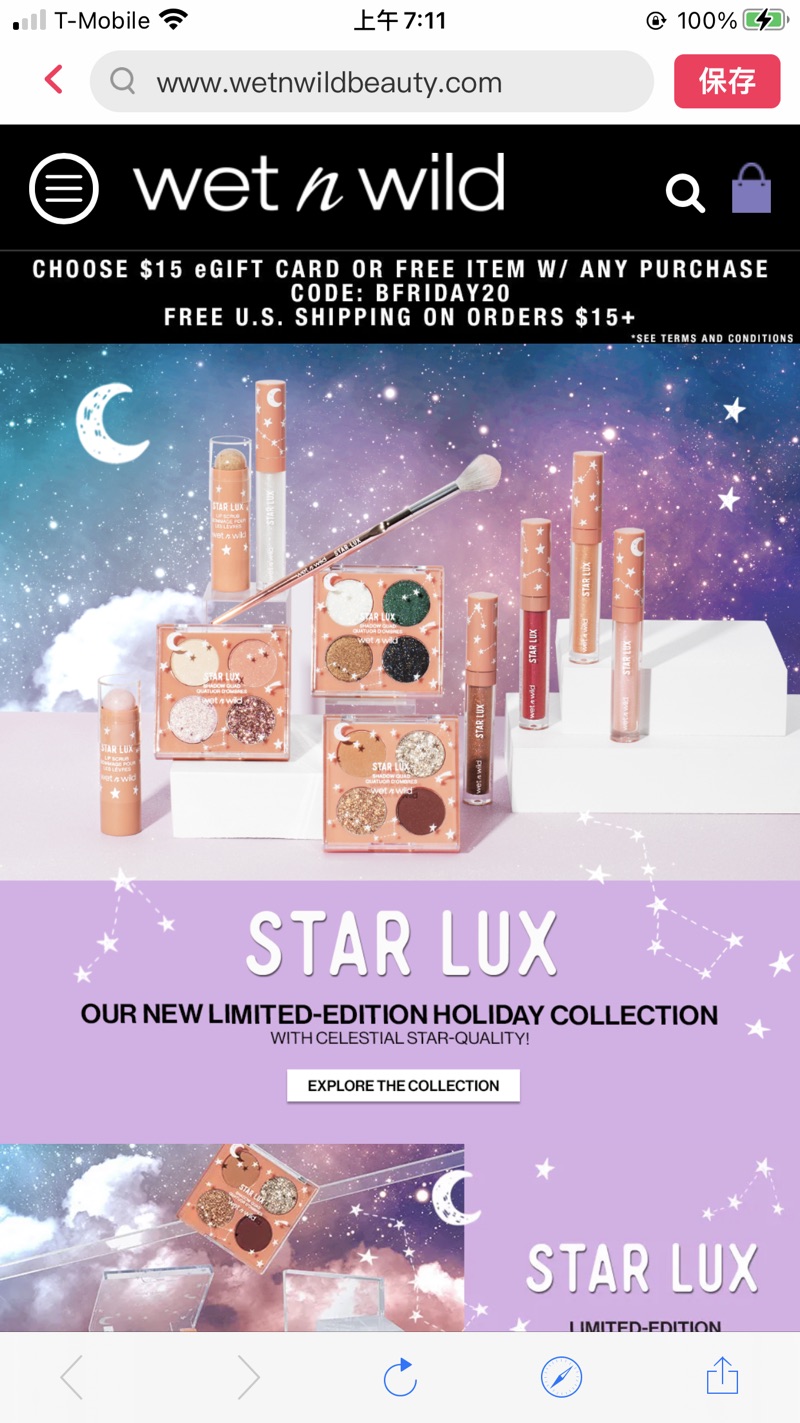 - Wet N' Wild 现有 全场彩妆任意单送$15礼卡或正装好礼, 需要使用折扣码 BFRIDAY20 。
