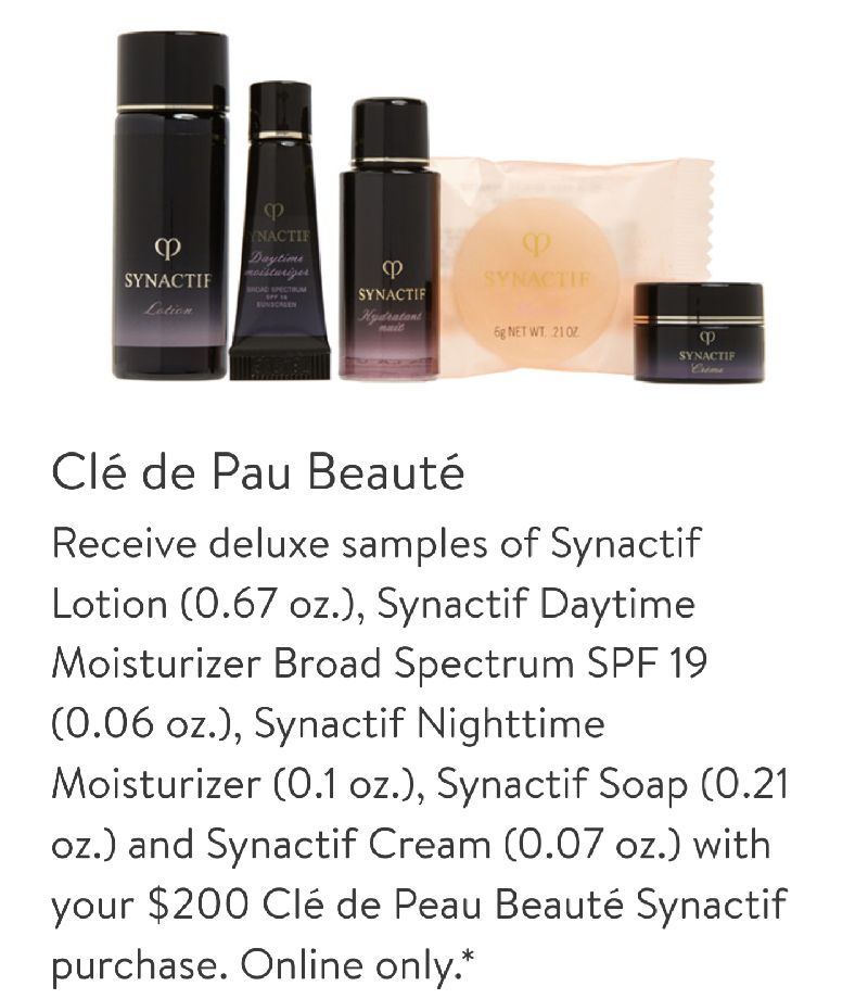 - 第一重:购买CPB任意彩妆护肤香氛满$200送5件豪华中样,截图见下方。包括高端线Synactif系列乳液0.67oz,日乳0.06oz,夜乳0.1oz,香皂0.21oz和面霜0.07oz,价值高达$123。