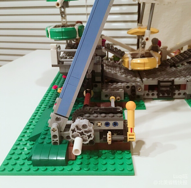 这款全部是物理机械操作。简单来说,就是根据图纸,一步步拼搭,拼完之后,摇动白色小把手,摩天轮就会转动了。我不是很建议为它配电动套装,自己手摇转动比较有趣。而且,你想想,你幸幸苦苦拼完了,duang,按上个电动机,让他自己转,会不会有点小失落。不过想要按电动套装的,可以买8883和88000,安装也超级超级方便。黄色把手,是用来控制摩天轮下方的坡道。一摇,坡道收起,乘客下车厢。在一摇,坡道展开,摩天轮可以开始转动了。