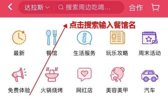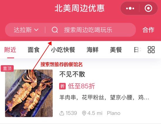 1. 点击周边优惠,进入自己的对应城市,搜索想推荐的餐馆。