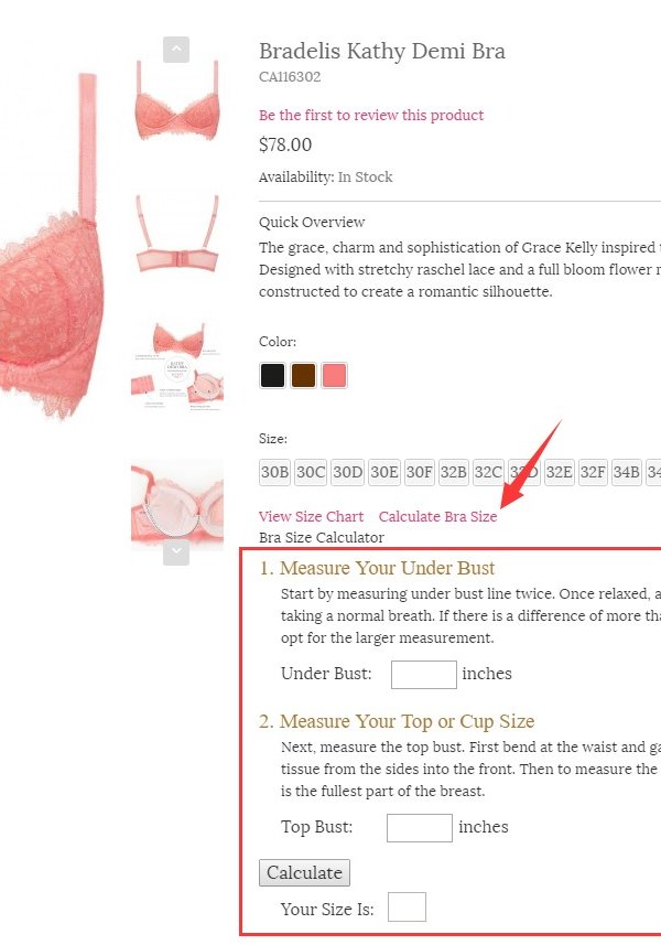 Bradelis的实体店很少,很多胖友们没有办法到店里试穿,只能盲撸,比如君君就是生生盲撸。如果不能试穿的朋友也不用着急,Bradelis的网站可以帮你量出适合你的尺码,只需要你自己量出自己的围度,输入就可以计算出你的尺码(见下图)。怎么量出正确的尺码?请见:胸部问题不能忽视 内衣你穿对了么?