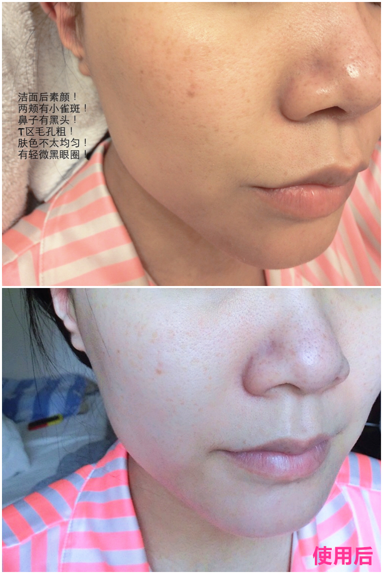 国际惯例自报一下我的肤质:春夏混油,秋冬混干,敏感皮;两颊有小雀斑,T区毛孔较大且有黑头,有黑眼圈问题,且最近也冒了一点小干纹,好多问题哈…