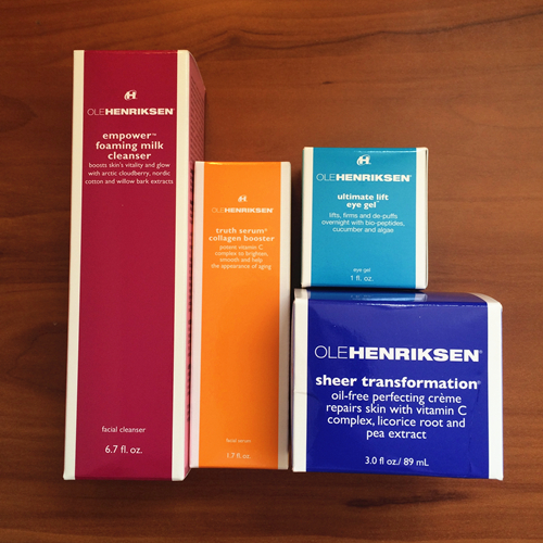 我的皮肤状态:额头太阳穴下易长痘痘,下巴有痘印。每天睡醒鼻子会有点油~脸颊除了超冷超干的天气会起皮,平时状况还算ok~化妆频率是一周2次~面膜基本是天天敷。在使用Ole Henriksen前用的是Kiehl’s 高保湿系列洗面奶,水,面霜。以及他们家的午夜修复精华和眼霜。