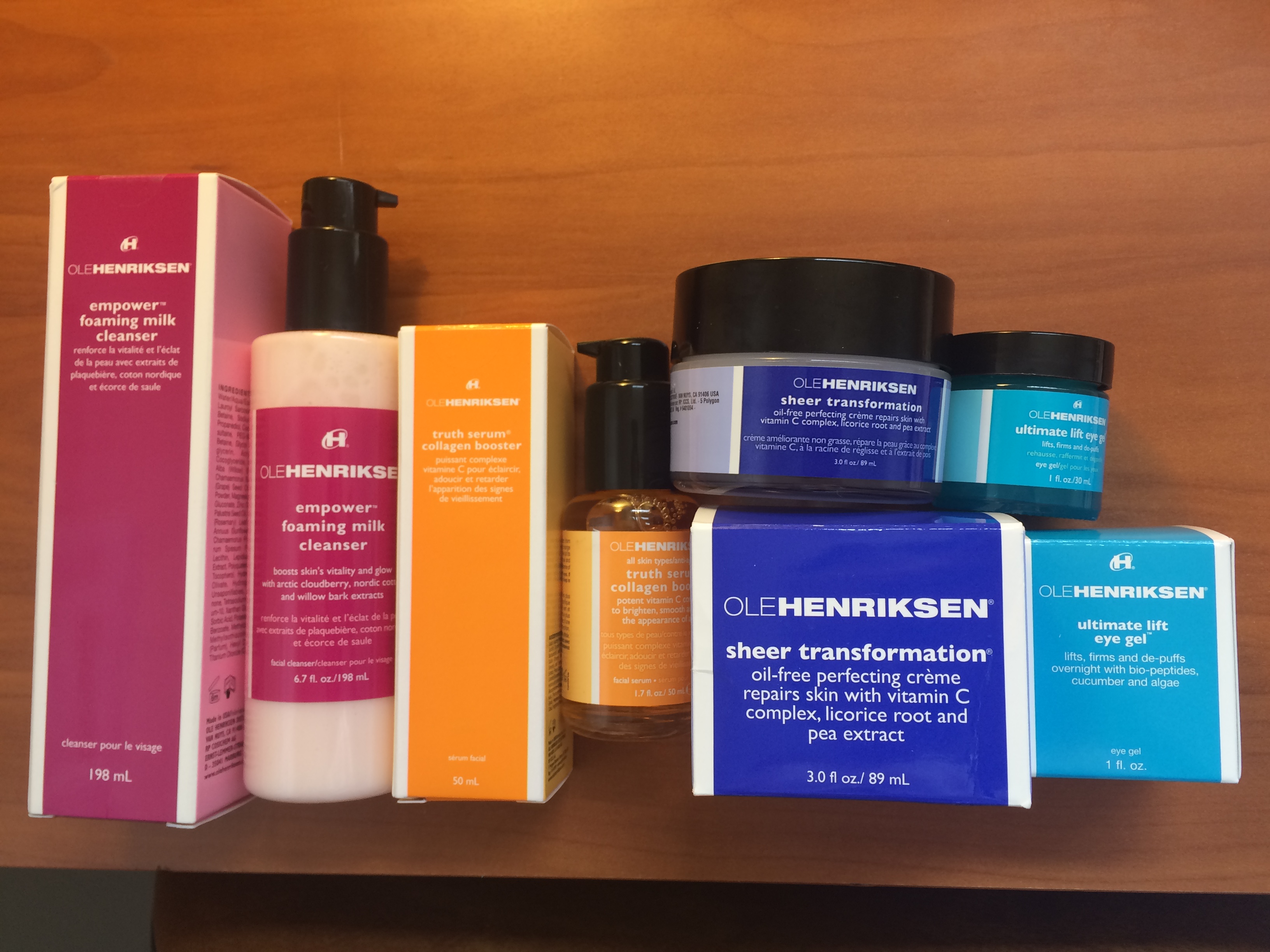 打开后依次是Empower Foaming Milk Cleanser,Truth Serum Collagen Booster,Sheer Transformation,和Ultimate Lift Eye Gel: