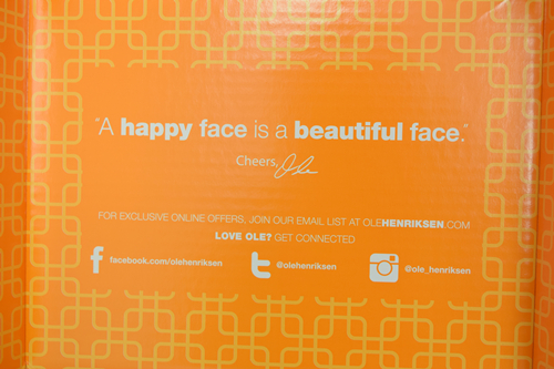 Ole Henriksen官网家的receipt是贴在盒子后面的,有一层塑料纸包着,所以下雨潮湿也不怕坏掉。打开盒子之后,盒盖子上写着这么一句话。我很喜欢,分享给大家。希望各位北美君的粉丝们每天都有happy和beautiful的脸~