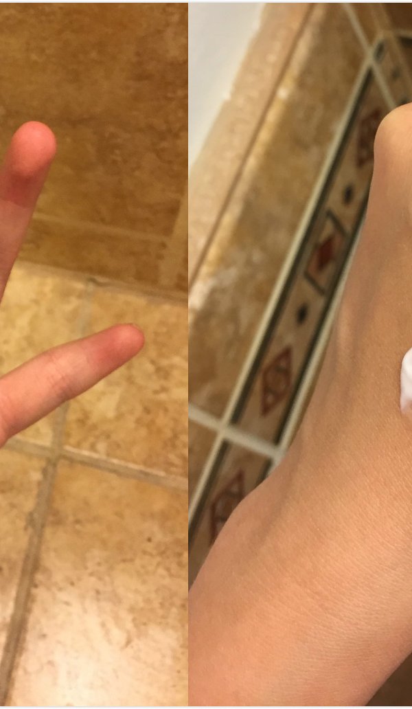 防晒霜是第二天起来第一次试用。前面已经按洗面奶——精华——保湿霜的顺序涂好了,像下图左边。还是有一些变化的,感觉较前一天要水嘟嘟一点。右边是涂好防晒的样子。