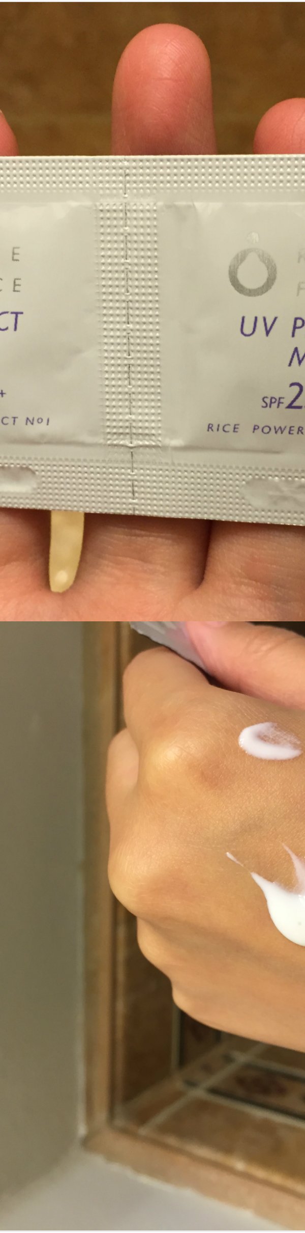 防晒霜给了这样两袋,每袋是一回分的用量。防晒指数为25,两个加号。质地比较轻薄,很典型的日系防晒,不油腻,成膜也快。
