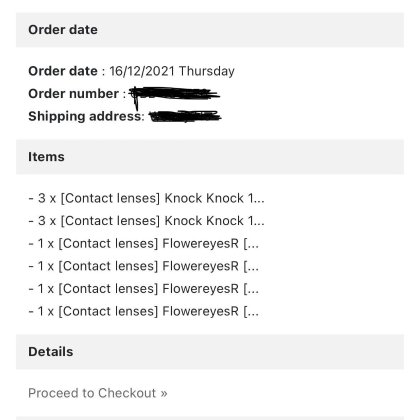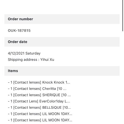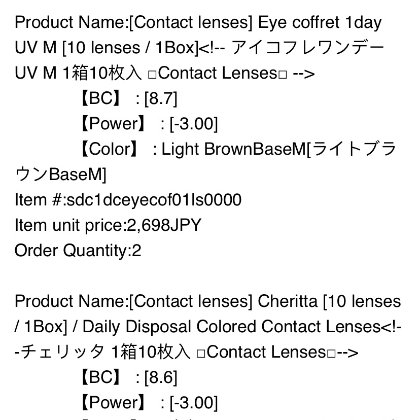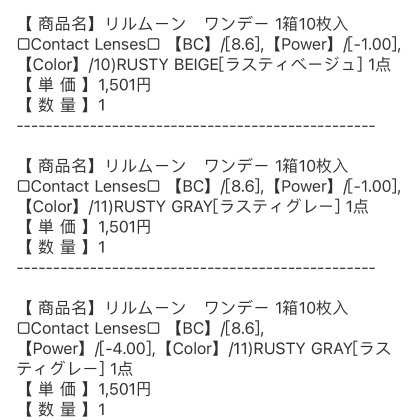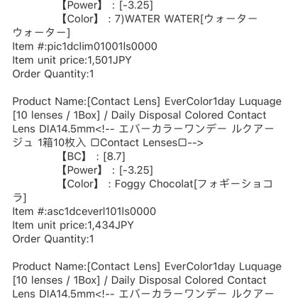 - 发货提醒:隐形眼镜均由日本DHL或EMS发货,建议使用EMS邮寄选项,DHL抽查较为严格,如果您的包裹停留海关或状态在3天或更长时间以上未更新,可能是遇到小几率海关抽查,DHL会联系用户提交相关资料。