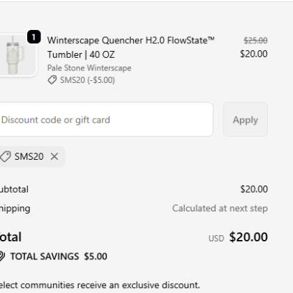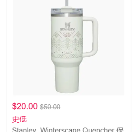 - Stanley官网 全场低至5折+部分额外8折, 需要使用折扣码 SMS20 或 FOLLOW20。