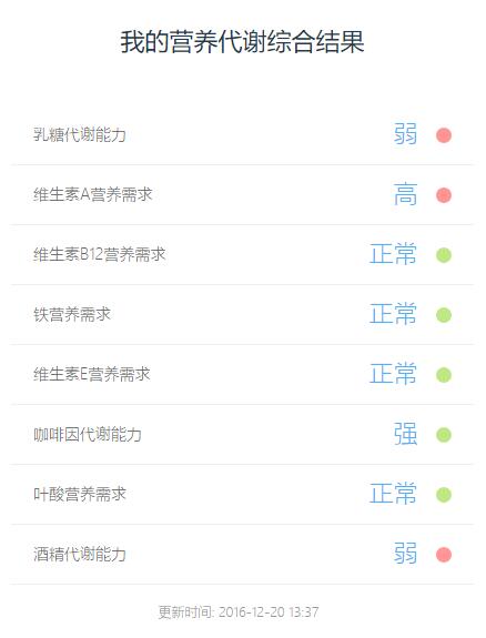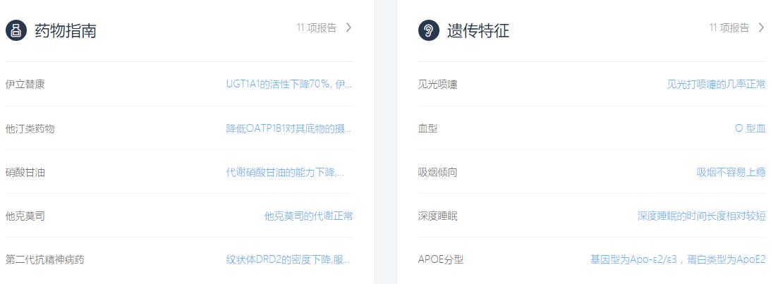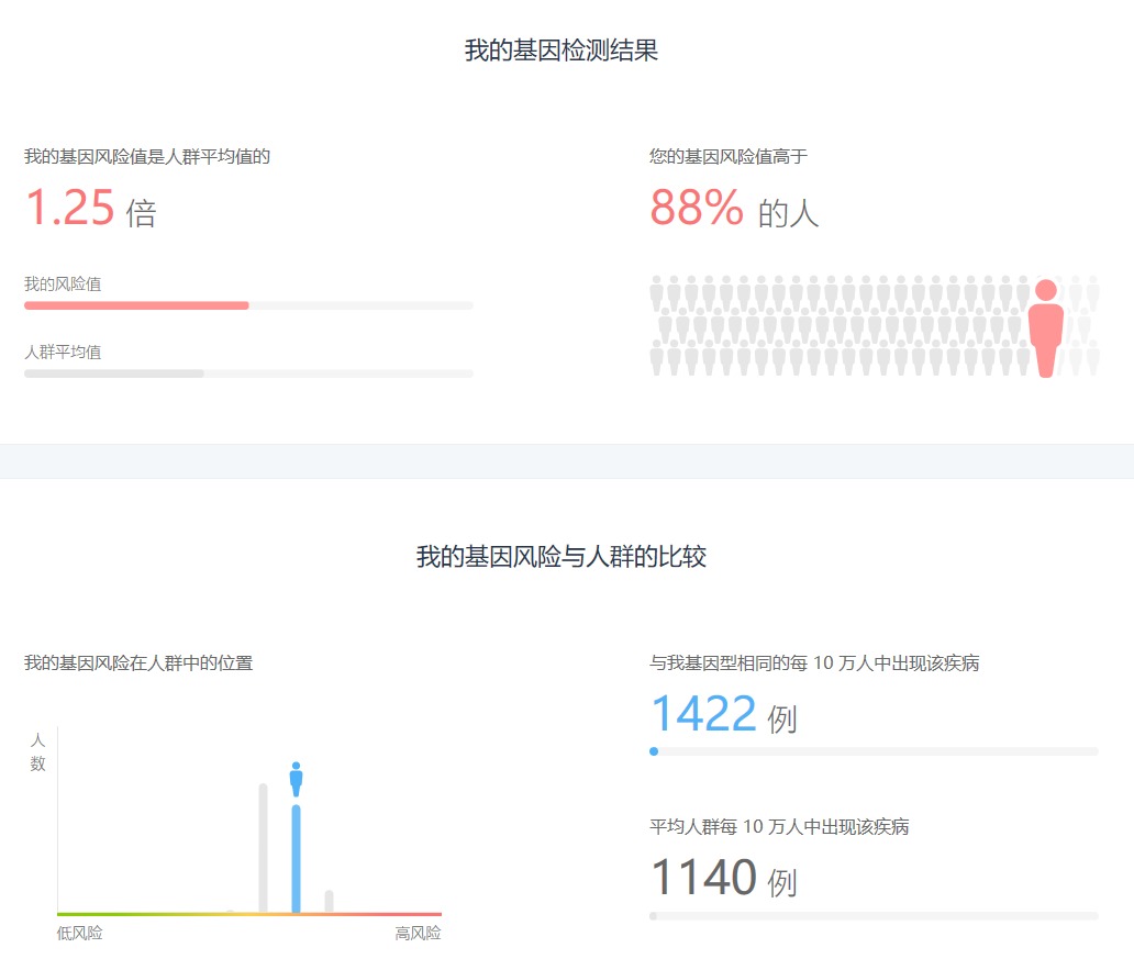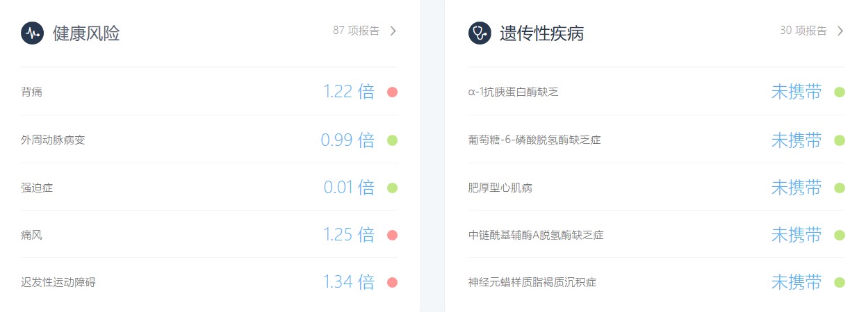 健康风险这一部分,是非常有实际意义并且能够反应体检结果的。栗子:码少的父亲已经有痛风的症状了,以前喜欢的海鲜也已经完全不碰了。码少近期体检尿酸含量也偏高,痛风的几率也高于人群平均值。体检报告结合基因检测,码少是时候管住嘴迈开腿了,再见了我的刺身。