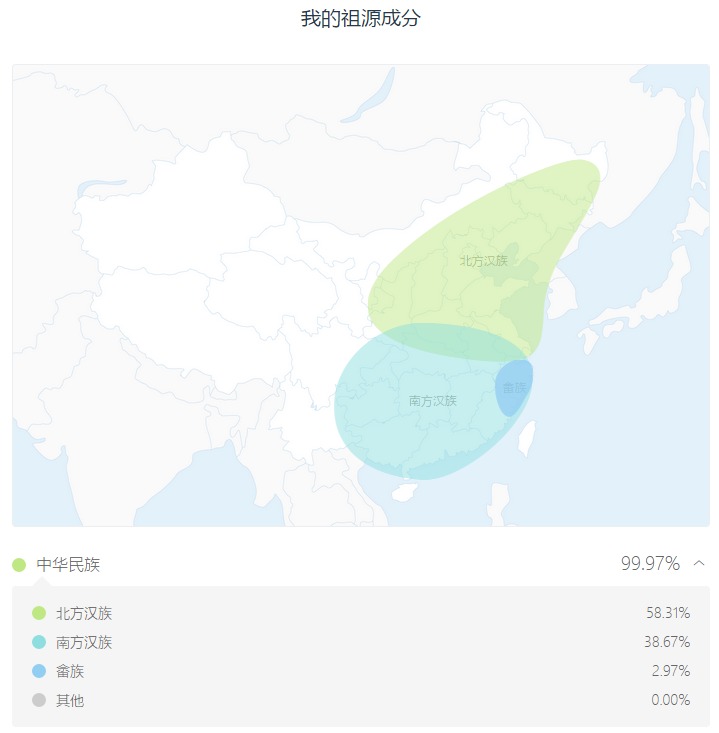 首先让我们来一起看看“非酋“血统的码少的现状吧。进入祖源分析,码少首先看到自己是个”根正苗红“的南北混血汉族,随着数据库不断完善,7号56.67%的南方汉族血统已经更新成58.31%北方汉族了。畲族是一个古老的南方游耕民族,在码少故乡有个叫做姜畲的小镇,不知是否和畲族有着丝缕联系。