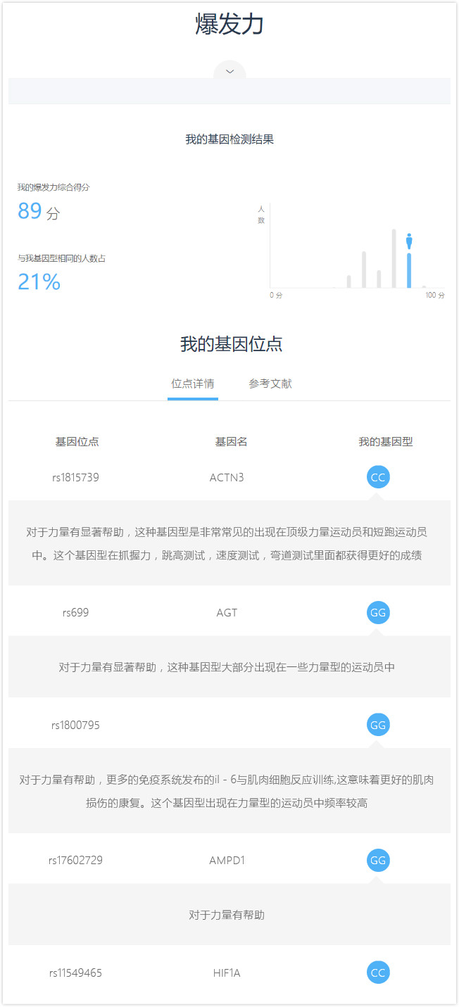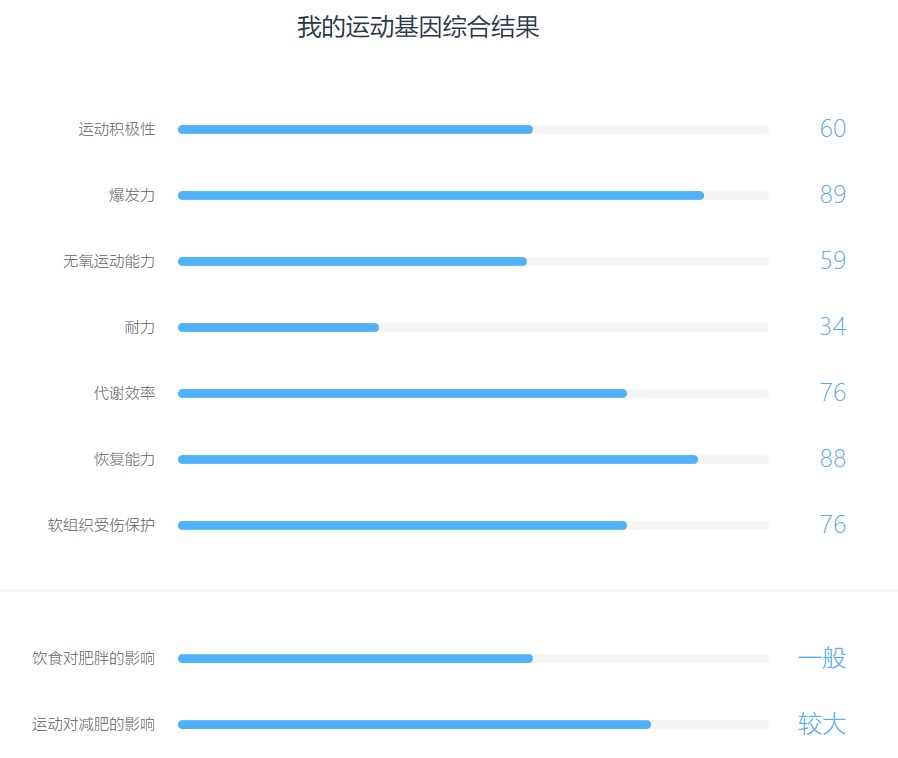 点开相应子项目,可以获得更详细的检测报告。不得不说检测结果相当准确,码少的力量和爆发力确实不错,然而全速冲刺只能续航50m也是硬伤。另外,对于减肥这个沉重的话题,通过WeGene的报告,码少终于明白不管怎么吃草,依旧是75kg以上。接下来,码少要好好珍惜自己”动动就能瘦“的体质了。