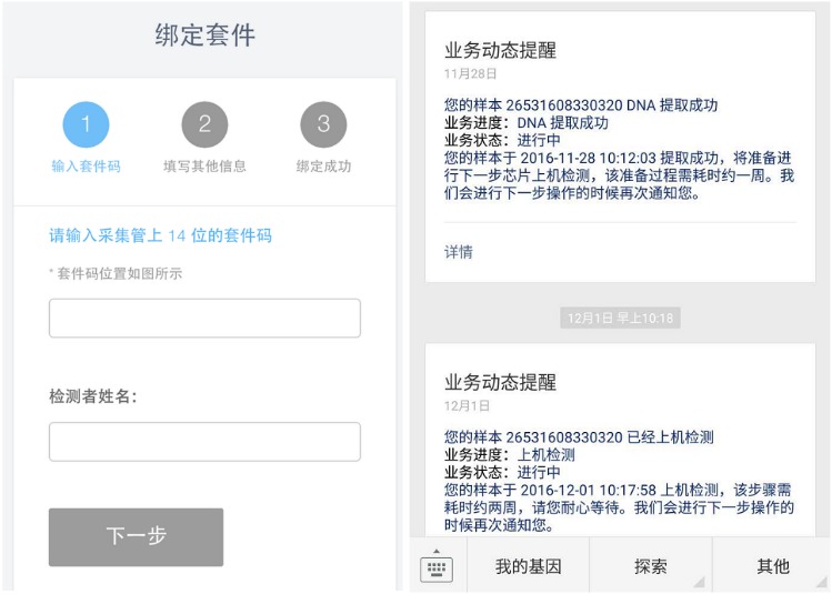 借用WeGene官网图片,DNA采集过程非常简单,按照说明将唾液采集后放在生物安全袋中并装好,再顺丰到付即可。当然,采集器的编号是要微信绑定的,以便实时接收检测进度和最后的检测报告,采集+绑定过程10分钟就能搞定。接下来,就是漫长的等待啦,WeGene微信号会全程追踪并反馈基因检测的进度,对于“不刷新不舒服斯基”的码少还是挺受用的。从11月7日收到样本,到12月7日的检测报告,WeGene用时仅1个月!