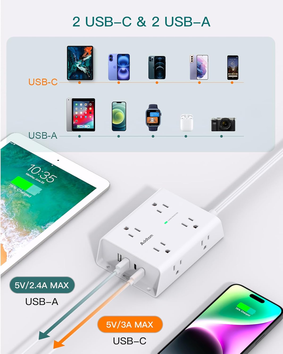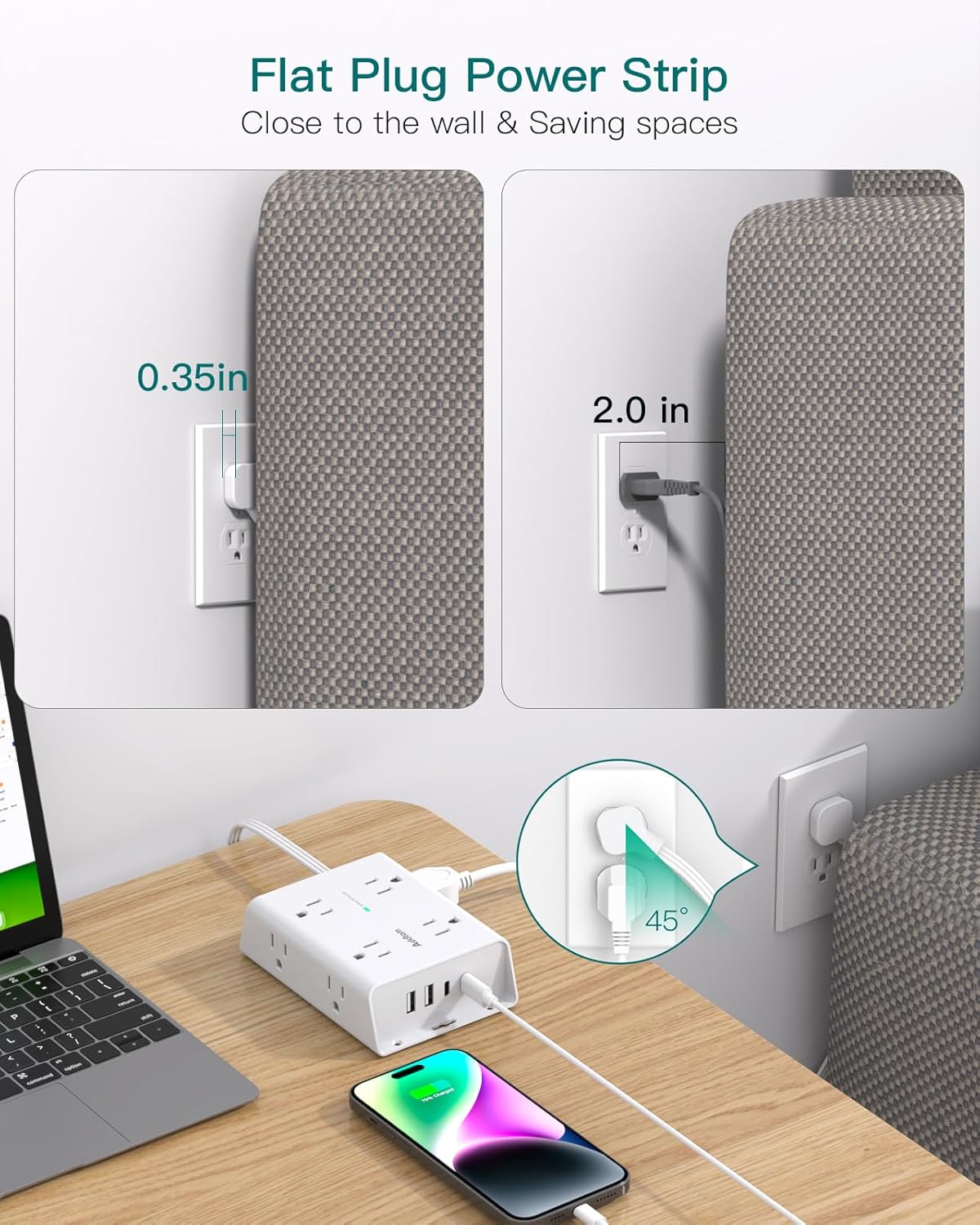 Editor's Pick: This 15ft power strip features an ultra-thin flat plug and 45-degree angle design, making it easy to fit against walls and hide behind furniture. Equipped with 8 AC outlets and 4 USB ports (including 2 USB-C), it can power multiple devices simultaneously. The three-sided layout provides ample spacing between outlets to accommodate large adapters. Integrated with triple surge protection circuits and an overload protection switch, it ensures safety for all connected devices.