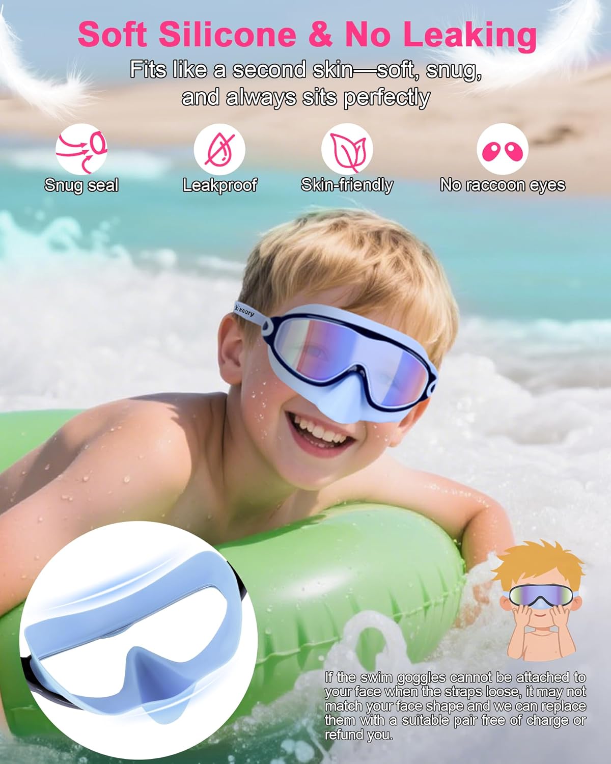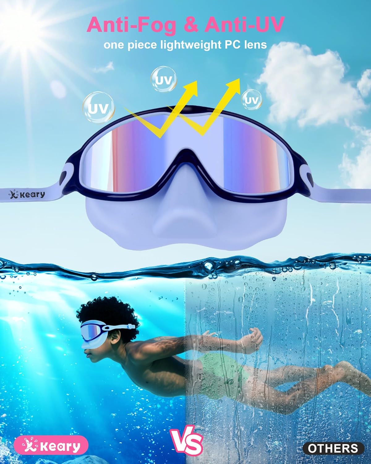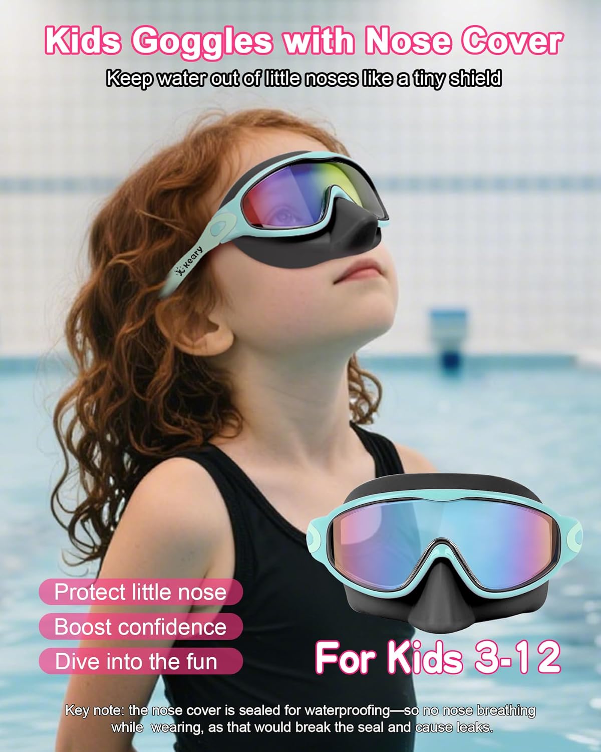 Editor's Pick: These goggles are designed for children ages 3-12, featuring a nose cover that effectively blocks UV rays and prevents fogging. The soft, adjustable straps ensure a comfortable and secure fit, making them suitable for boys, girls, and toddlers at the pool or during water activities.