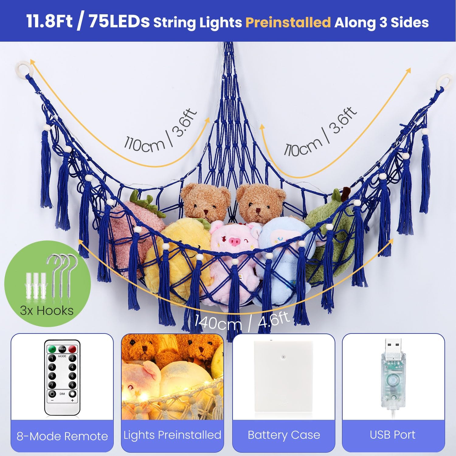 Editor's Pick: This plush toy hammock is handcrafted from high-quality cotton rope, eco-friendly and durable, with metal rings ensuring a stable structure that maintains its shape. It comes pre-installed with 75 warm white LED lights on three sides, requiring no assembly, powered by USB or battery box (batteries not included), with a remote control that toggles between 8 lighting modes. The 55-inch triangular design is perfect for corner installation, supports 22-33 pounds, and can neatly store numerous stuffed animals, pillows, or blankets. It not only saves floor space but also adds a cozy Bohemian-style decoration to children's rooms or bedrooms.