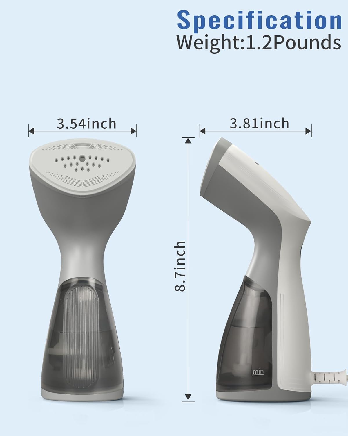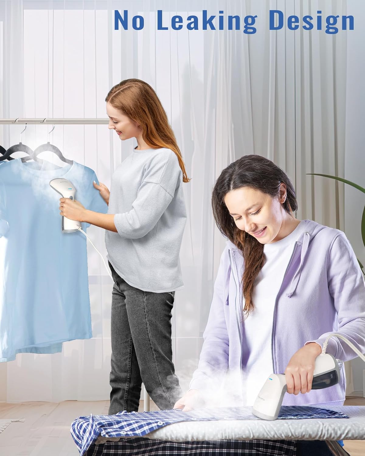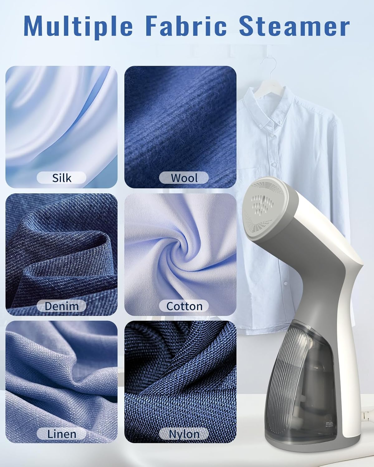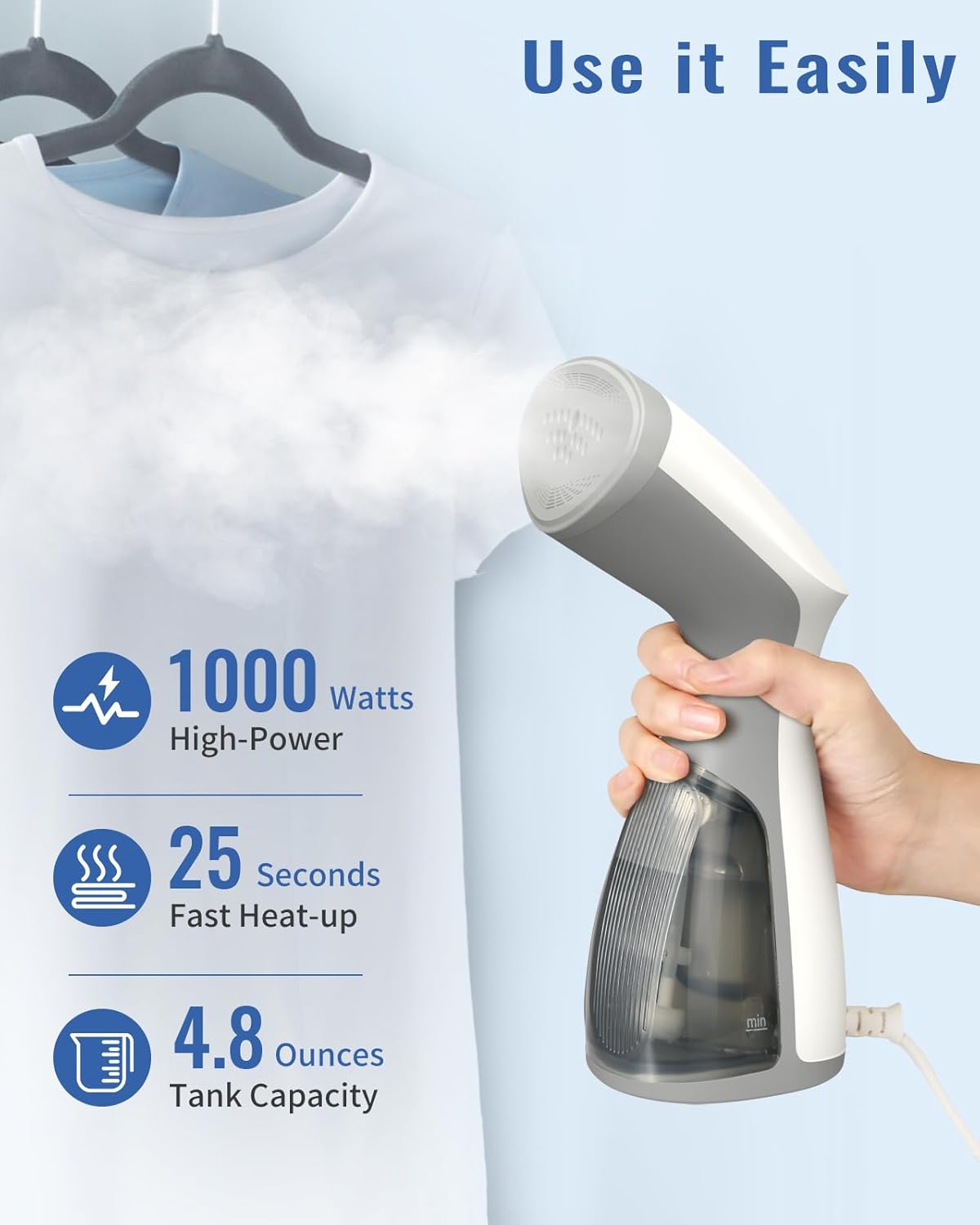 Editor's Pick: This handheld garment steamer features 1000W power, heating up in approximately 25 seconds to produce strong steam. It comes with a detachable 140ml water tank and a 7.9ft (2.4m) power cord for flexible use. The anti-leak design works in both vertical and horizontal positions, suitable for various garments, curtains and other fabrics, and includes fabric brush and soft brush attachments.