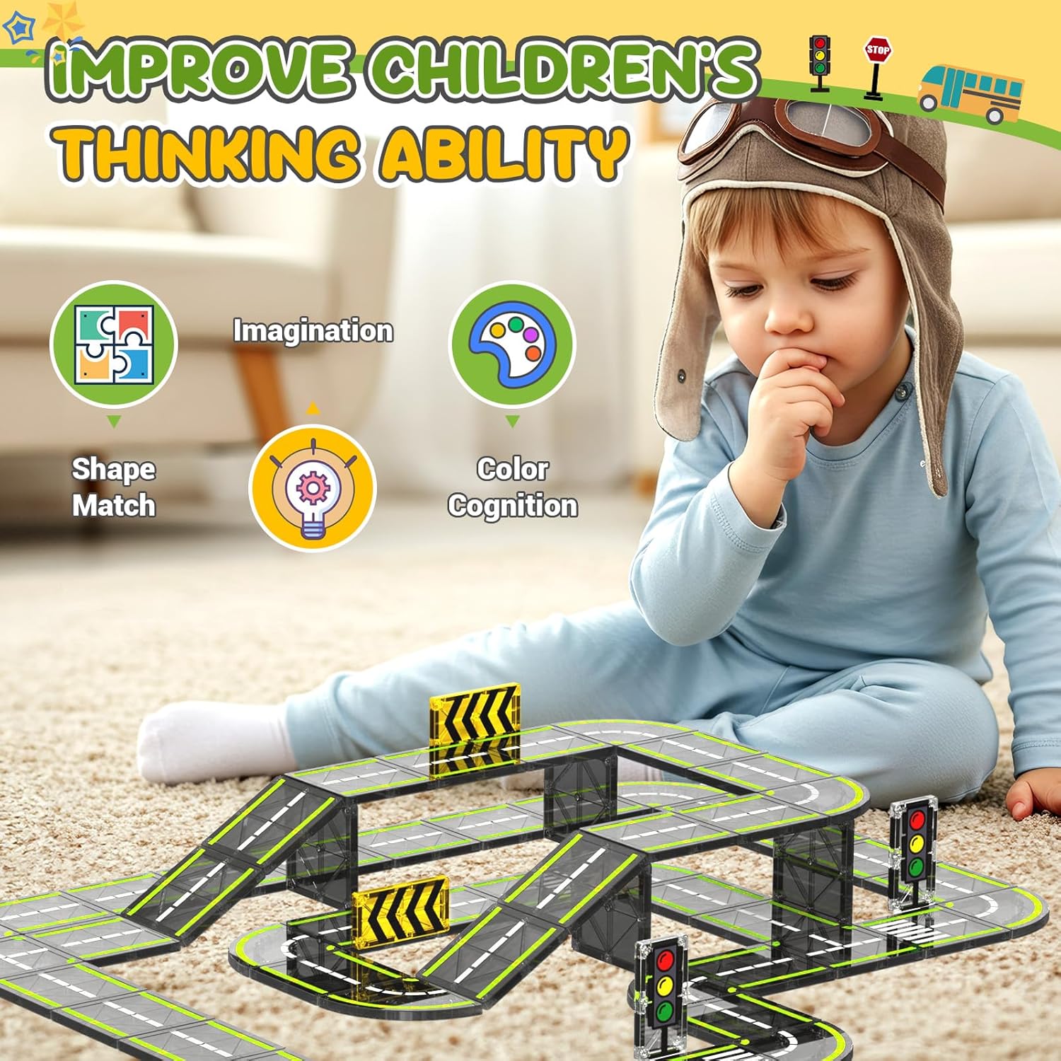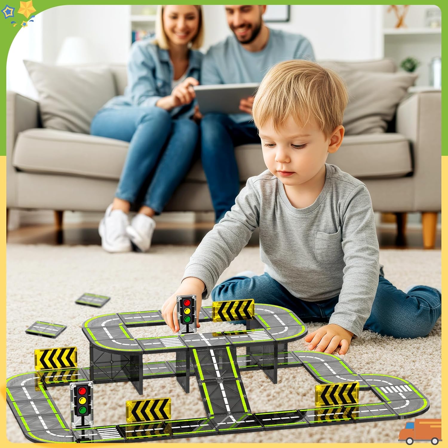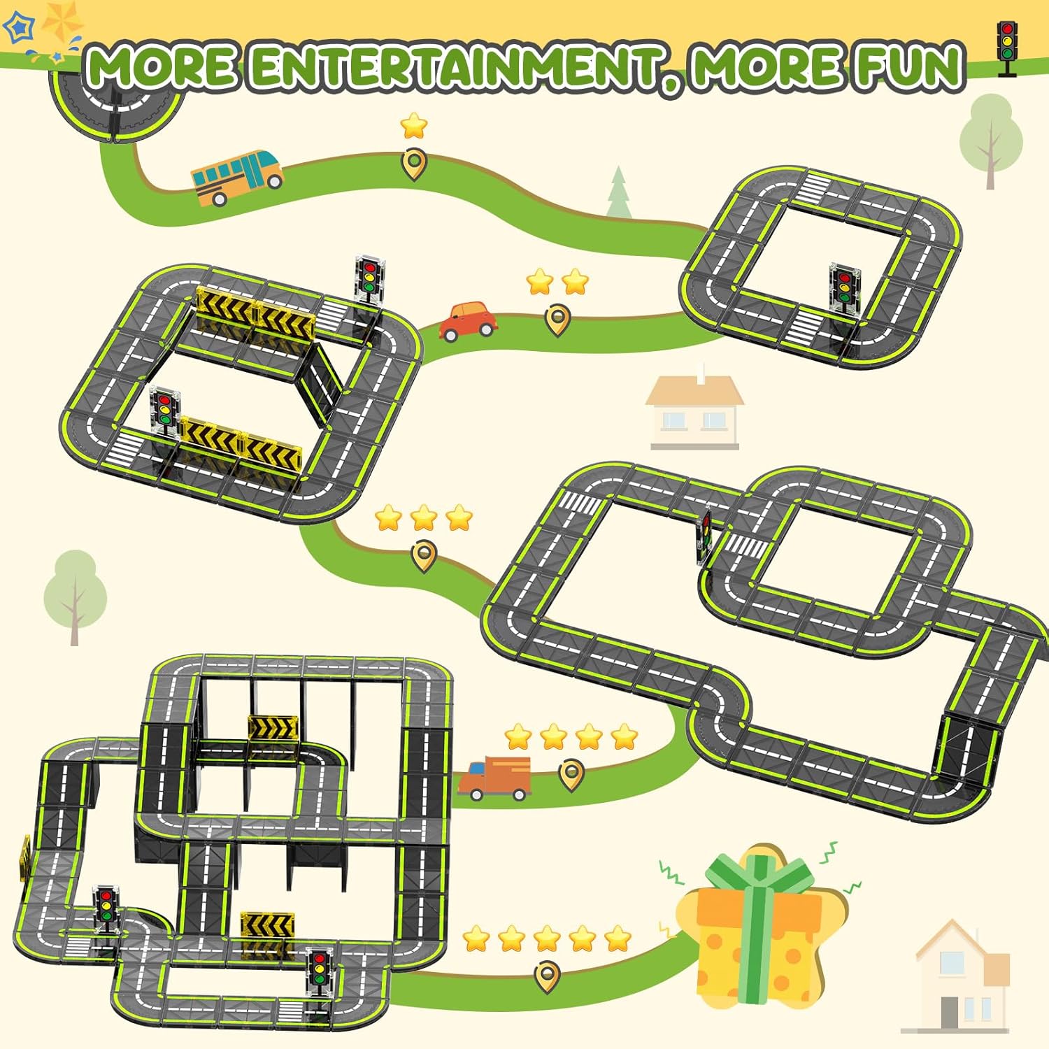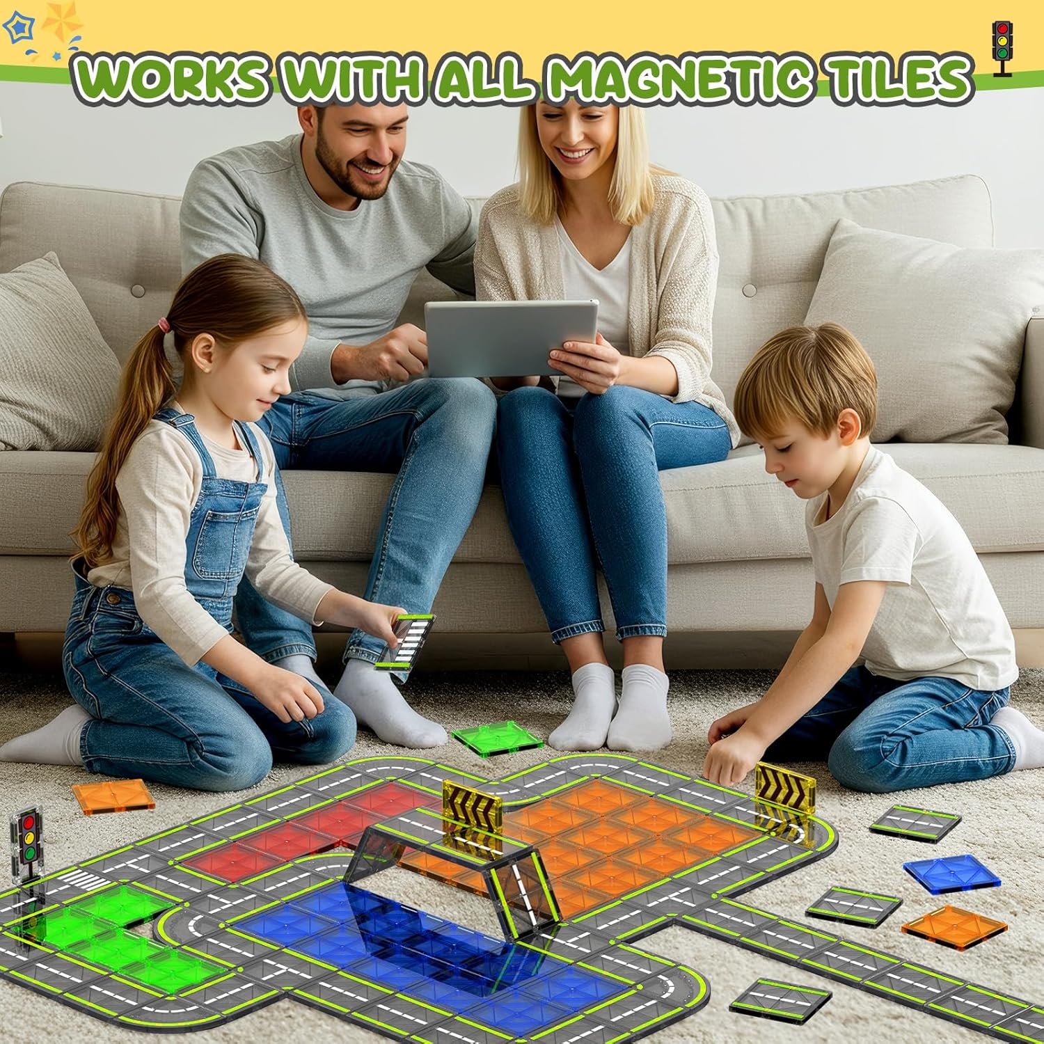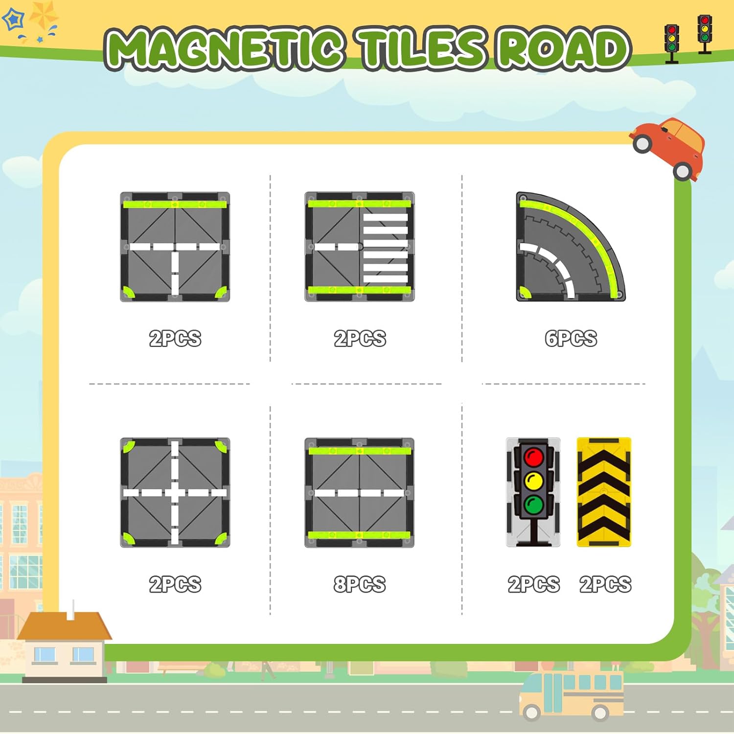 Editor's Pick: This magnetic tile road set includes 24 road accessories, including road tiles, traffic lights, and traffic signs that can be assembled into a complete race track. The strong magnetic connections are secure and compatible with most common magnetic tile sets on the market, allowing children to expand their builds and inspire creativity. Made with ultrasonic welding technology and high-quality ABS plastic, the pieces feature rounded edges and meet children's safety standards. Perfect for children ages 3 and up to develop hand-eye coordination and imagination through play.