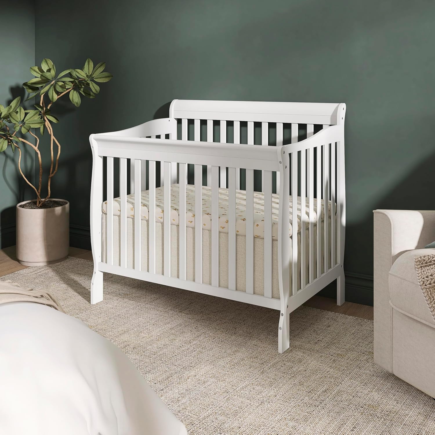 Editor's Pick: This Aden baby crib features a 4-in-1 convertible design that transforms from a mini crib to a mini day bed and twin bed, adapting to different stages of your child's growth. The frame is made from sustainably sourced New Zealand pine wood with non-toxic water-based paint. It offers three adjustable mattress height positions and includes a 1-inch mattress pad. The product is GREENGUARD Gold and BSA Safe Sleep certified, meeting all relevant safety standards.