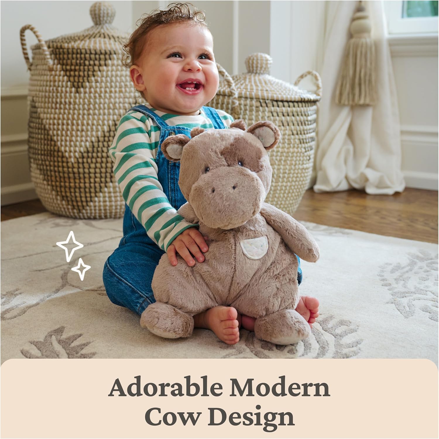 Editor's Pick: This cow-shaped plush toy is made from premium soft plush fabric with embroidered details for a comfortable touch. The feet and ears feature quilted knit textures that encourage tactile exploration, simulating the feel of a comforting security blanket. All materials are safe and machine washable, suitable for children ages 0 and up, making it a classic gift choice.