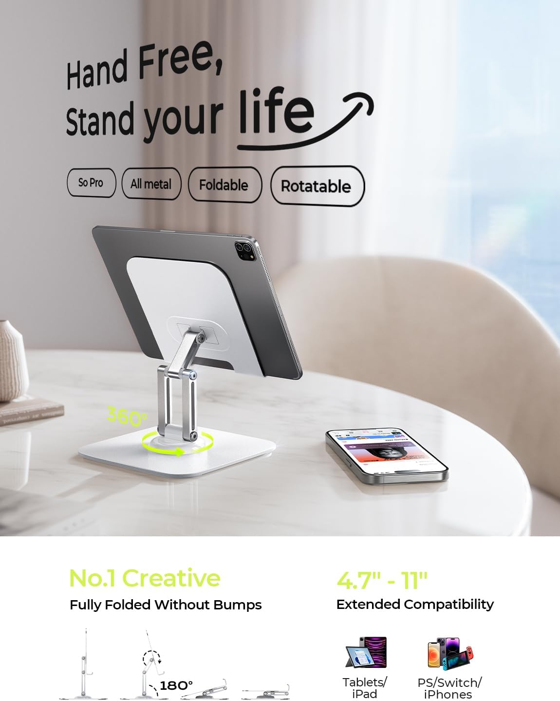 Editor's Pick: This tablet stand is made of aluminum-titanium alloy, balancing strength and lightweight design. With rotatable and height-adjustable features, it allows for use at different angles, suitable for office or home scenarios, providing stable support for devices like iPad, Kindle, and more.