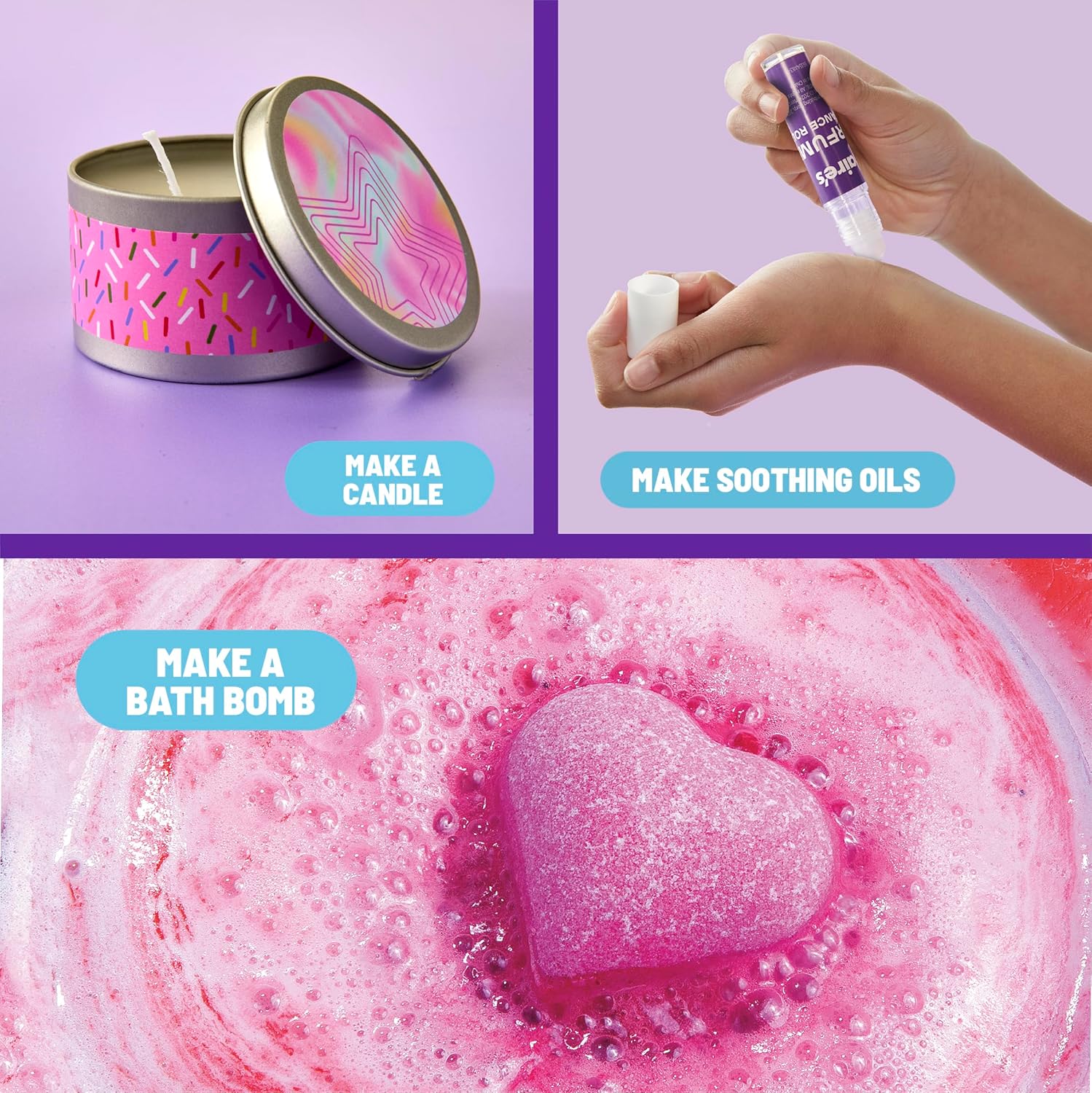 Editor's Pick: This DIY craft kit includes 32 pieces of materials to make bath bombs, aromatherapy candles, and soothing roll-on oils. The set provides real ingredients like lavender or vanilla fragrances, glitter, dried flowers, and mixing and scooping tools. Children can explore changes in colors, scents, and textures under adult supervision while creating personalized beauty products through this scientific craft experience.