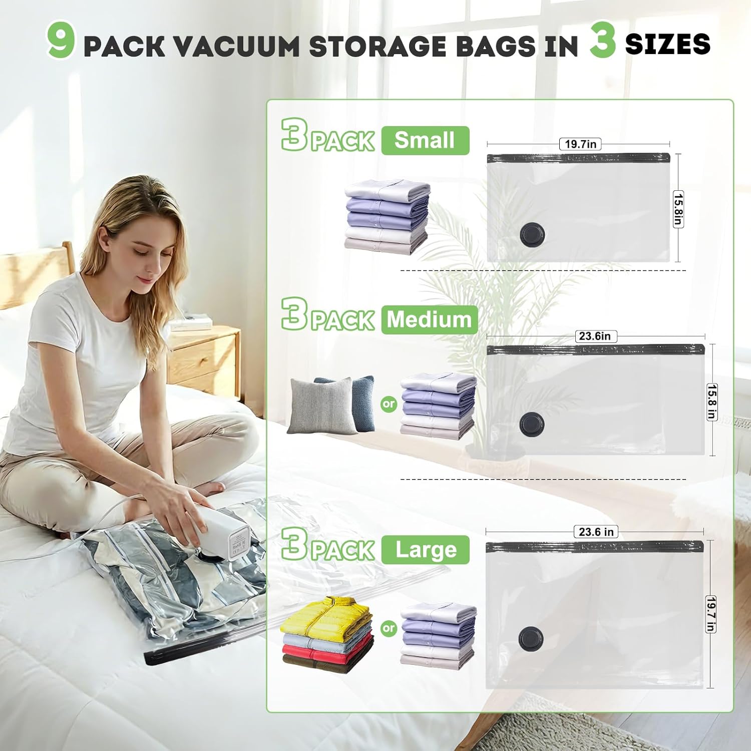 Editor's Pick: This vacuum storage bag set includes 9 bags in 3 different sizes, paired with a USB-powered electric pump with -60000Pa suction power for significant compression. Made with thickened PA+PE material, triple turbo valve, and double zipper seal design to ensure airtightness. The long-edge opening design makes it easy to insert clothing, perfect for saving space in your luggage when traveling.