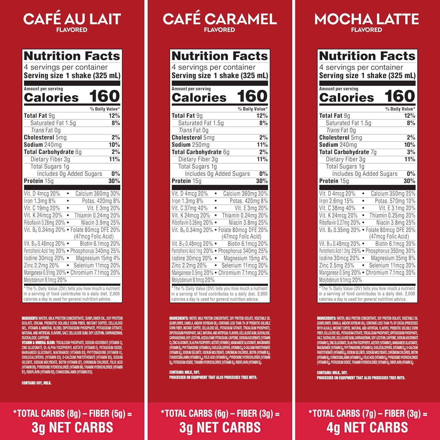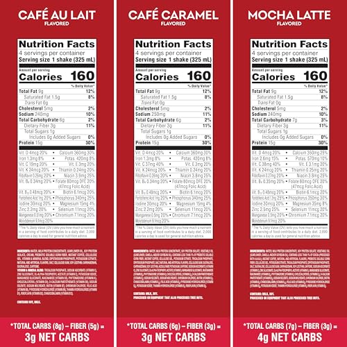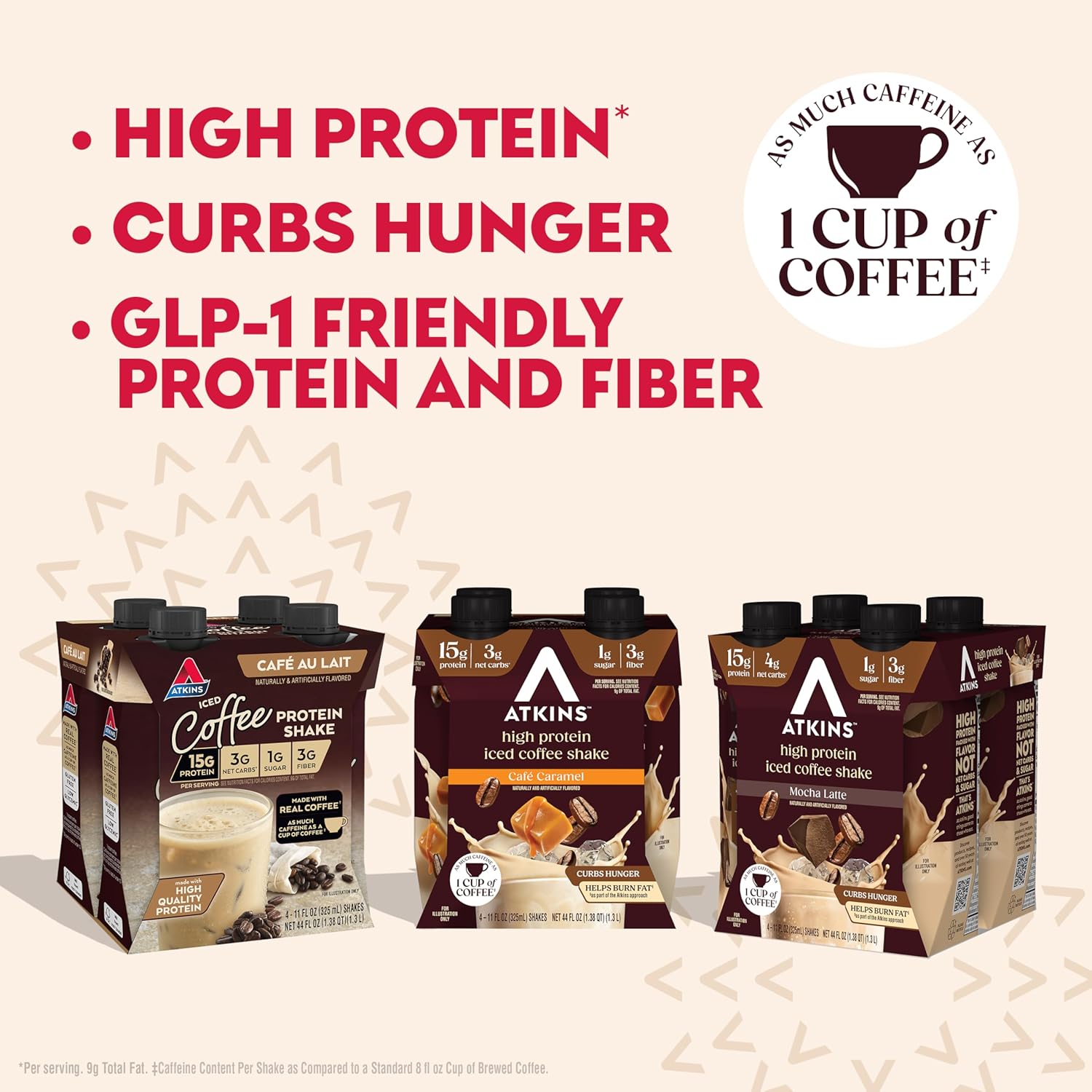 Editor's Pick: This Atkins protein shake variety pack includes Mocha Latte, Caramel Coffee, and Café au Lait flavors. Each bottle provides 15g of protein and 3g of dietary fiber. The formula is suitable for consumers who monitor their blood sugar levels. The ready-to-drink design makes it convenient for breakfast or post-workout nutrition.