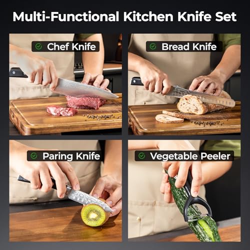 Editor's Pick: This knife set includes a chef knife, bread knife, fruit knife, and vegetable peeler to meet various cutting needs in the kitchen. Made from high-carbon German steel with a hardness of 56+ HRC, each knife is hand-polished to a sharp 15° edge angle on each side. The full-tang forged structure with a black ABS handle secured by three rivets provides a stable grip and durability.