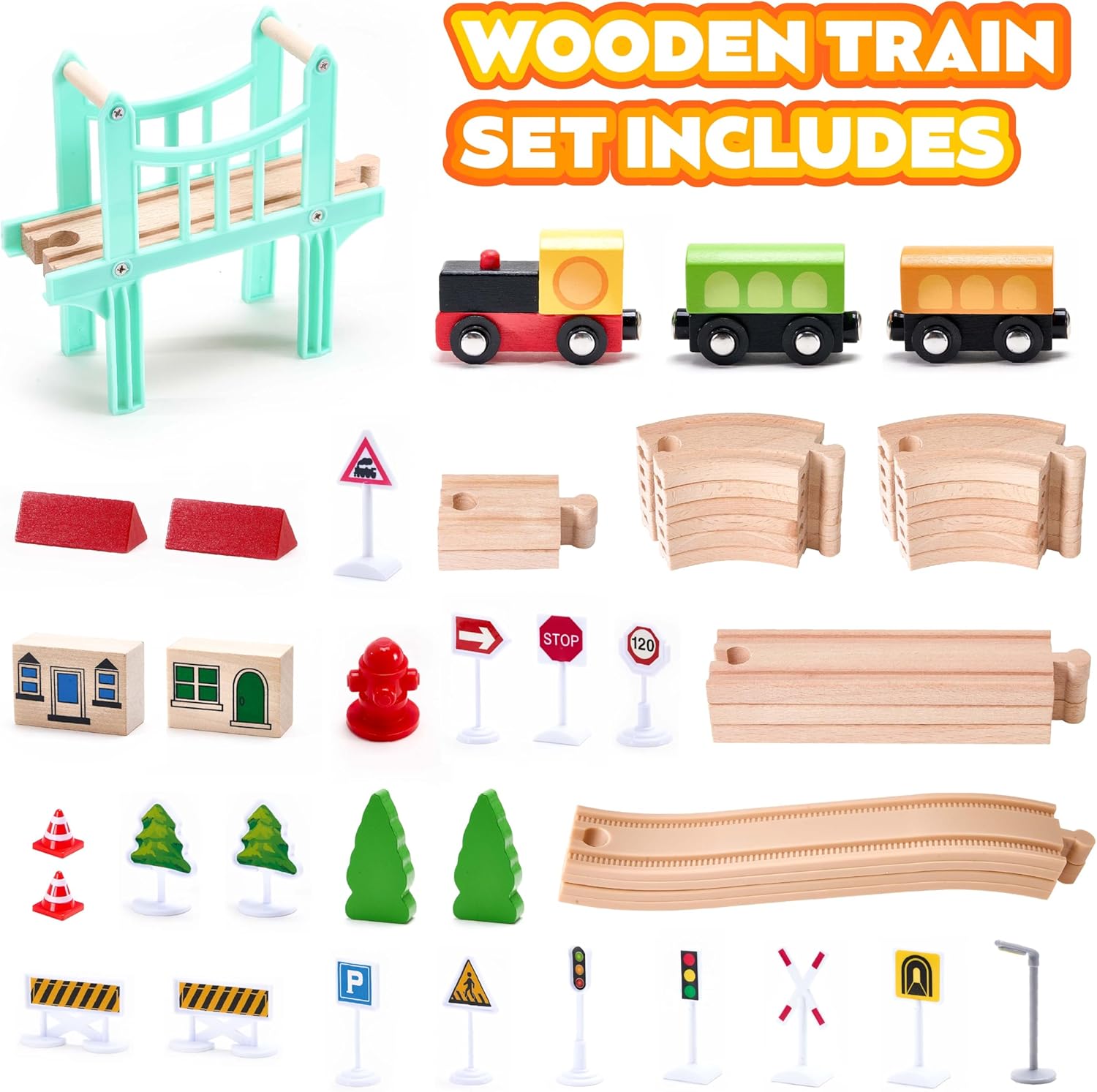 VigorFun Wooden Train Set 47 Pieces Compatible with Major Brands