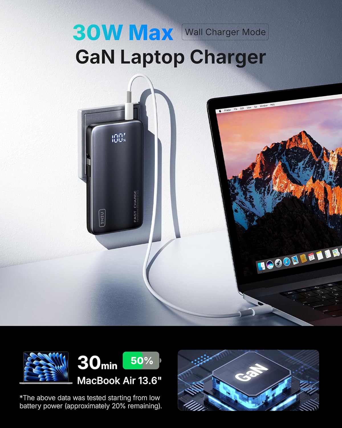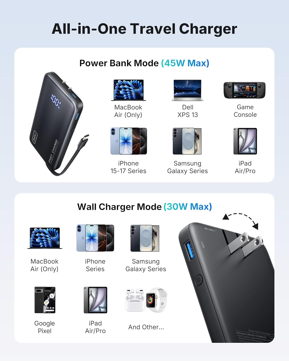 Editor's Pick: This power bank combines a portable charger, folding wall charger, and USB-C cable in one compact design. With a built-in 10000mAh capacity battery, it supports 45W fast charging output and can charge iPhones, Samsung devices, and some laptops. Using GaN technology paired with a braided USB-C cable, it offers both efficient charging and durability, perfect for daily commuting and travel.